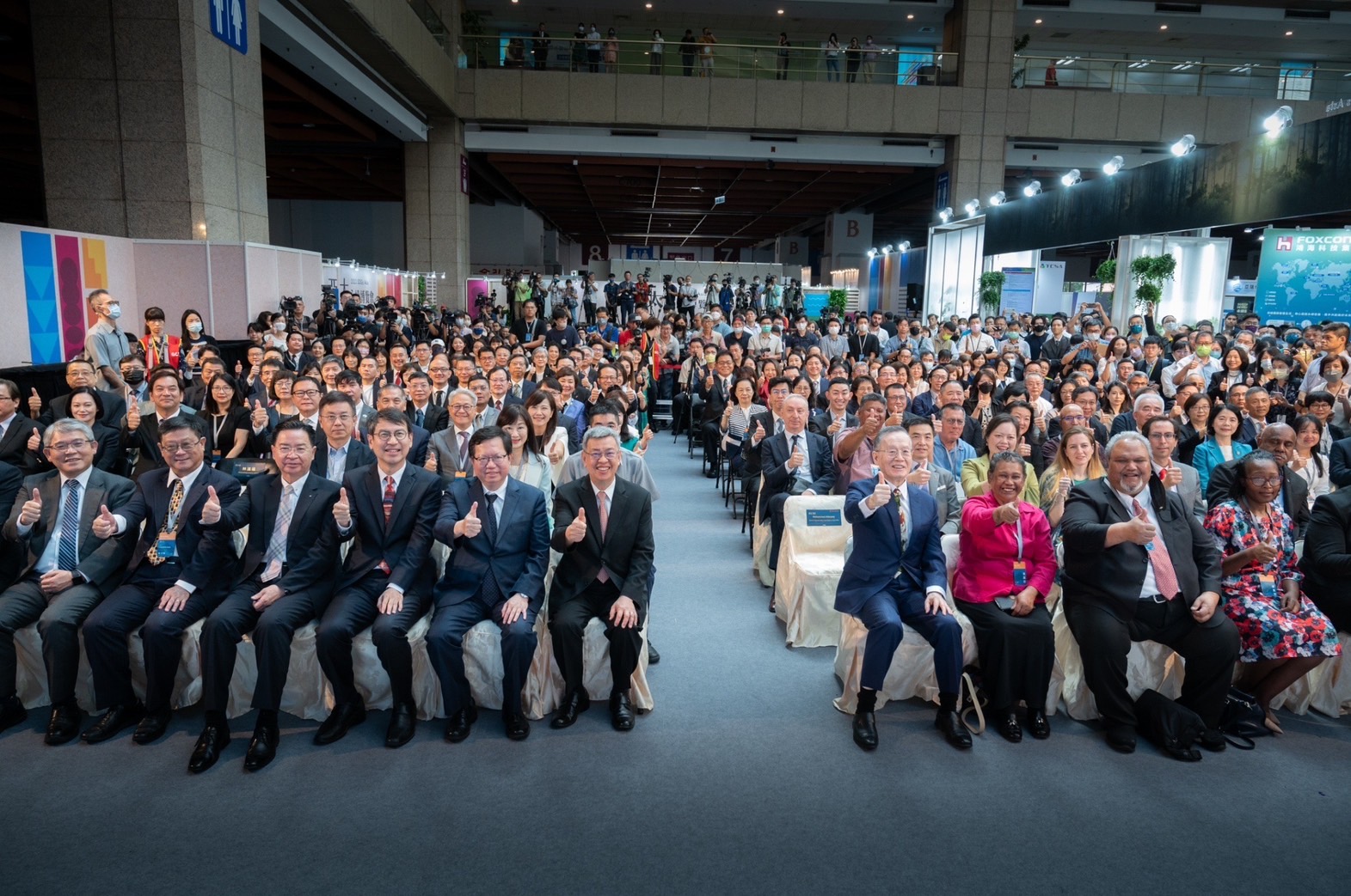 隨後,陳院長親自頒發獎座予20位「亞太暨台灣永續行動獎」獲獎企業代表,並與鄭文燦副院長、林子倫發言人、外交部吳釗燮部長、環保署張子敬署長、內政部花敬群次長、經濟部曾文生次長、簡又新無任所大使及我國友邦代表團等人於舞臺上手持SDGs標語手板比讚合影,為論壇揭開序幕。