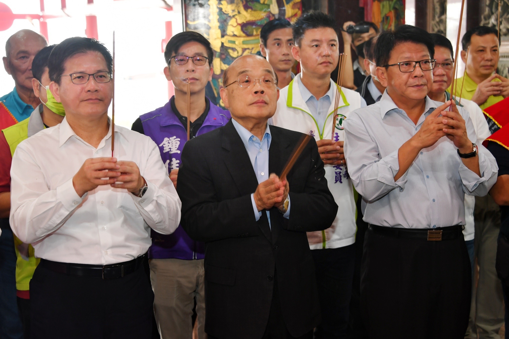蘇院長表示,很高興回到故鄉,來到鹽埔漁港,看到很多老朋友都很勇健,感到很高興,今日參拜祈求,盼臺灣安全,風調雨順、國泰民安、漁船滿載、五穀豐收。