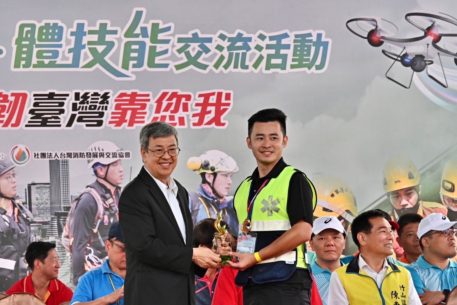致詞結束後,陳院長逐一頒發「火災搶救」、「車禍救援」、「救護技術」、「無人機運用」及「繩索救援」特優獎項獎座予16組、107位獲獎義勇消防人員;隨後,院長與行政院林子倫發言人、內政部消防署蕭煥章署長、羅美玲立法委員、蔡培慧立法委員、台灣消防發展與交流協會蔡世寅秘書長、南投縣竹山鎮陳東睦鎮長等貴賓與全國126隊義消人員參賽隊伍大合影,場面熱絡。