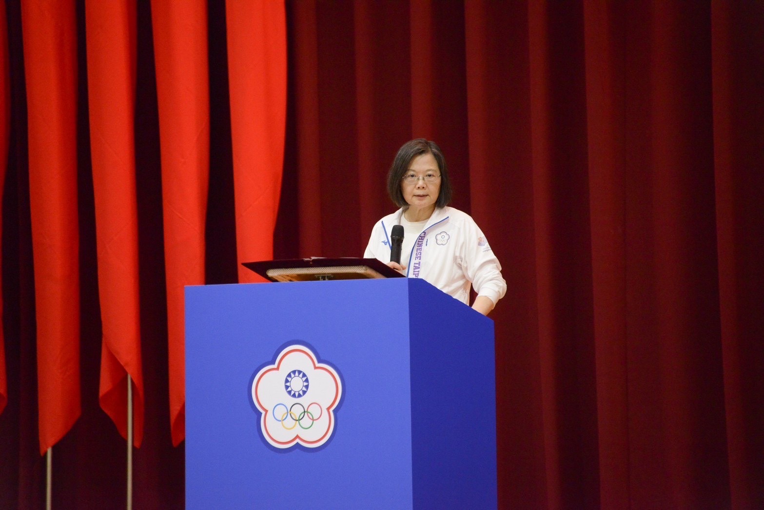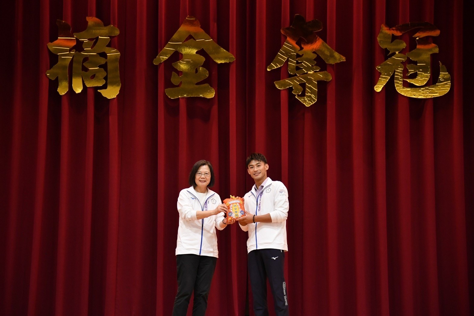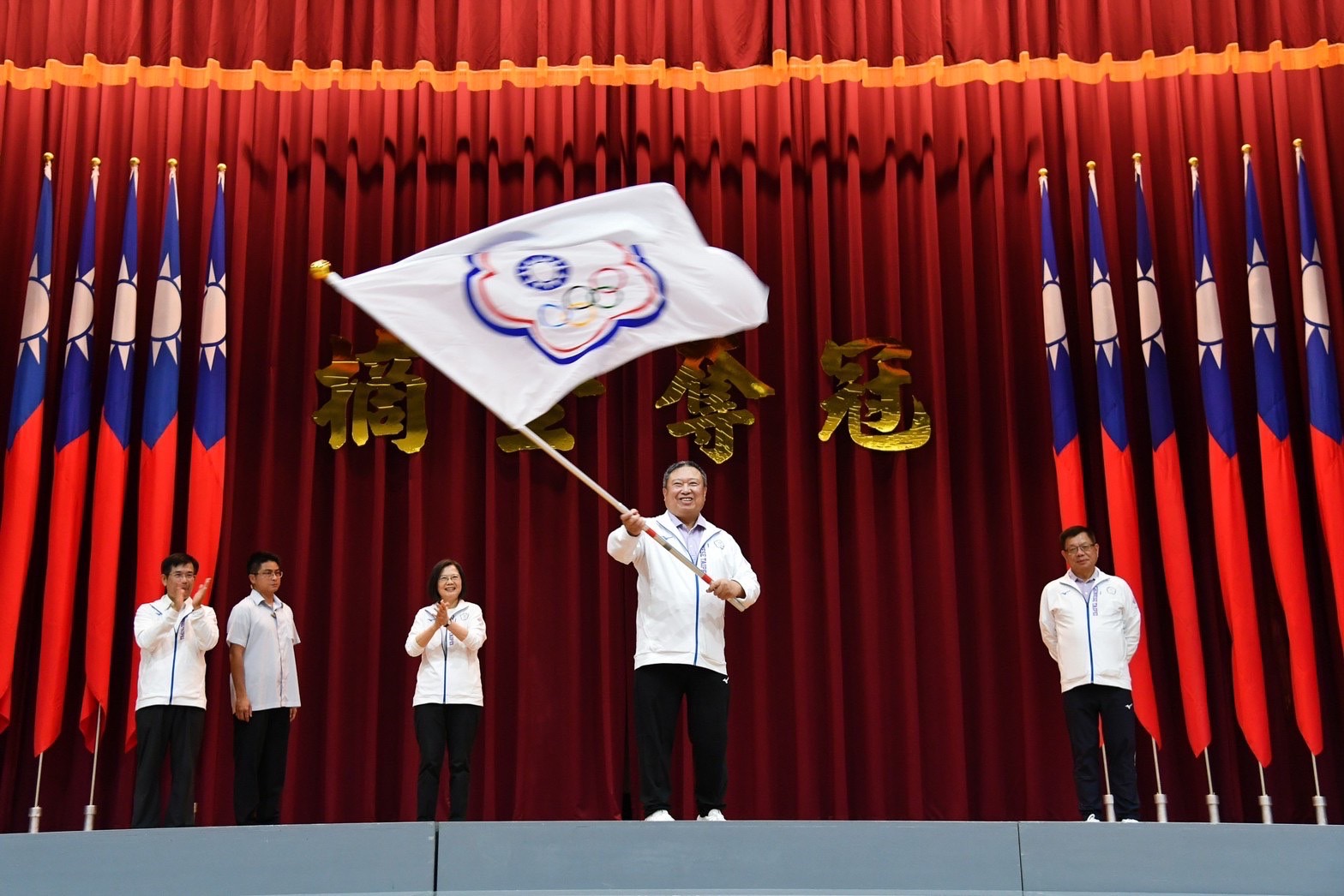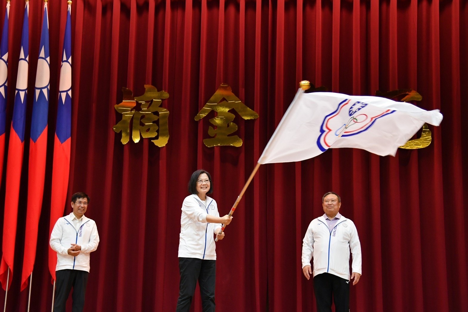 隨後,一行人前往國訓中心大禮堂出席「2022年第19屆杭州亞洲運動會」代表團授旗典禮,由蔡總統分別將國旗及團旗授予林鴻道團長,再由林團長授予蔡家福總領隊,總統並分別致贈代表團加菜金及平安御守,由郭婞淳選手及楊勇緯選手代表接受;最後,總統、陳院長等貴賓也與代表團成員合影留念,並一同高呼「萬眾一心 摘金奪冠」,祝福所有選手在此次杭州亞運能夠奪得佳績。