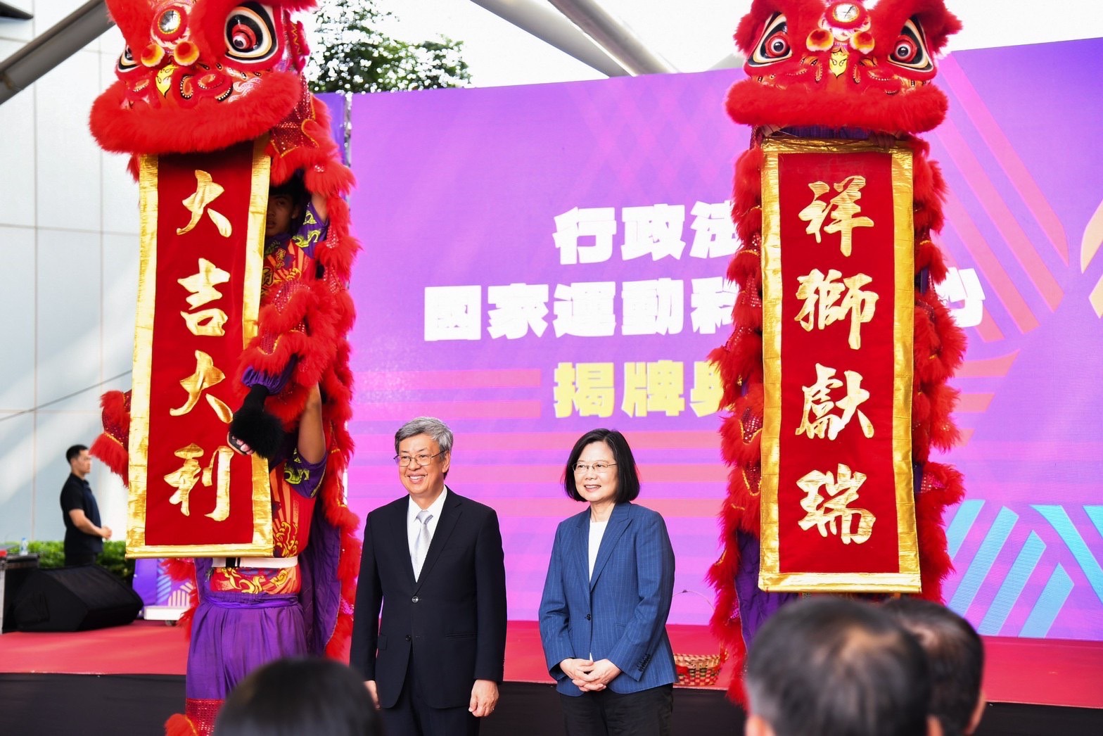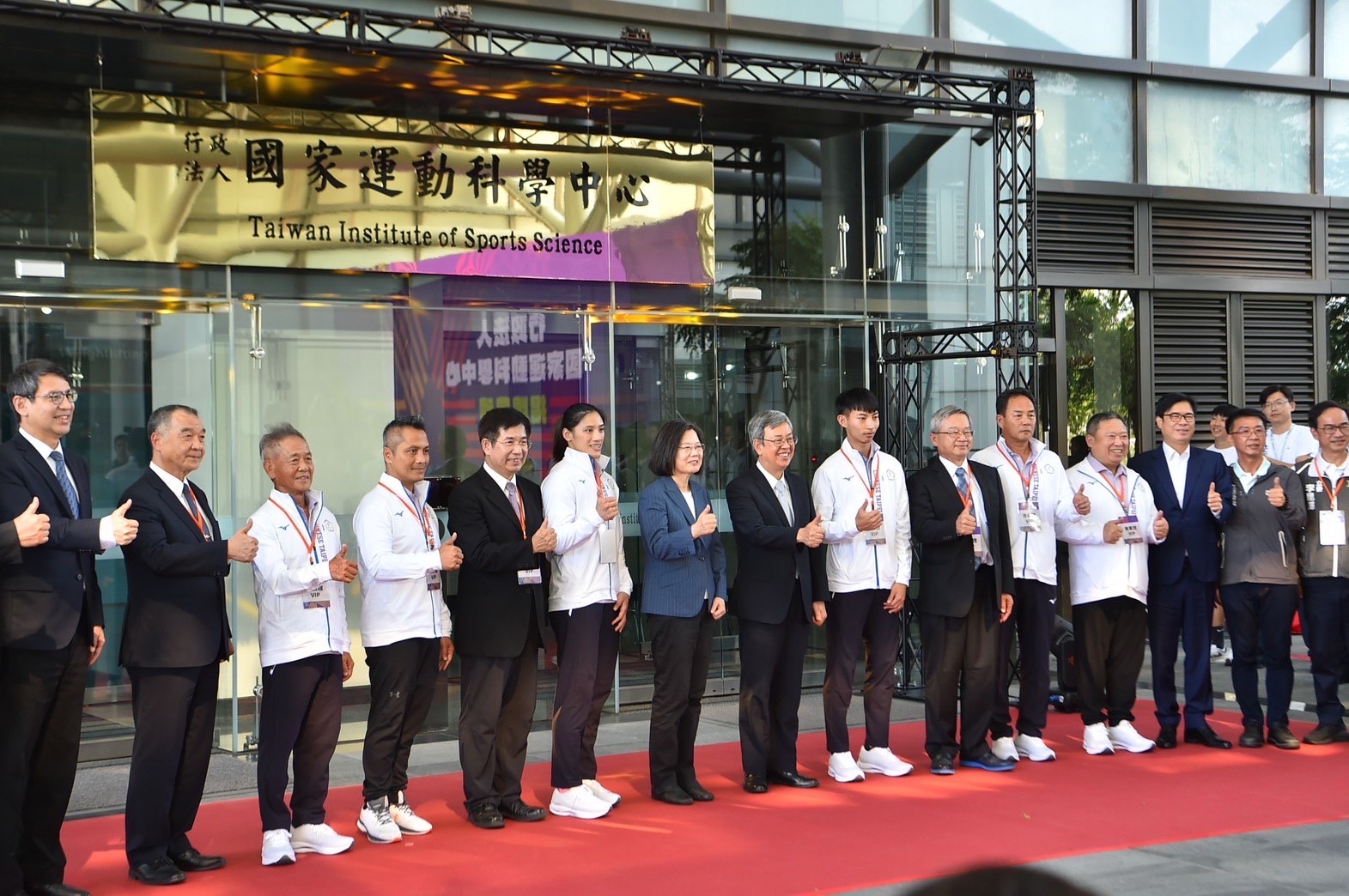 今日揭牌儀式在祥獅獻瑞的鑼鼓聲中熱鬧展開,陳院長陪同蔡英文總統到場後,首先在座位上和所有與會嘉賓一起合影留念,並聽取國家運動科學中心黃啟煌執行長說明「國家運動科學中心目標與展望」簡報;致詞結束後,蔡總統、陳院長、行政院李孟諺秘書長、林子倫發言人、國防部邱國正部長、教育部潘文忠部長、林騰蛟次長、體育署鄭世忠署長、高雄市陳其邁市長、許智傑立委、李昆澤立委、國家運動科學中心吳誠文董事長、中華民國奧林匹克委員會林鴻道主席、中華民國體育運動總會葉政彥會長、拳擊代表隊柯文明總教練、陳念琴選手、田徑代表隊孫念祖總教練、林昱堂選手等人一同進行揭牌儀式並合影留念。
