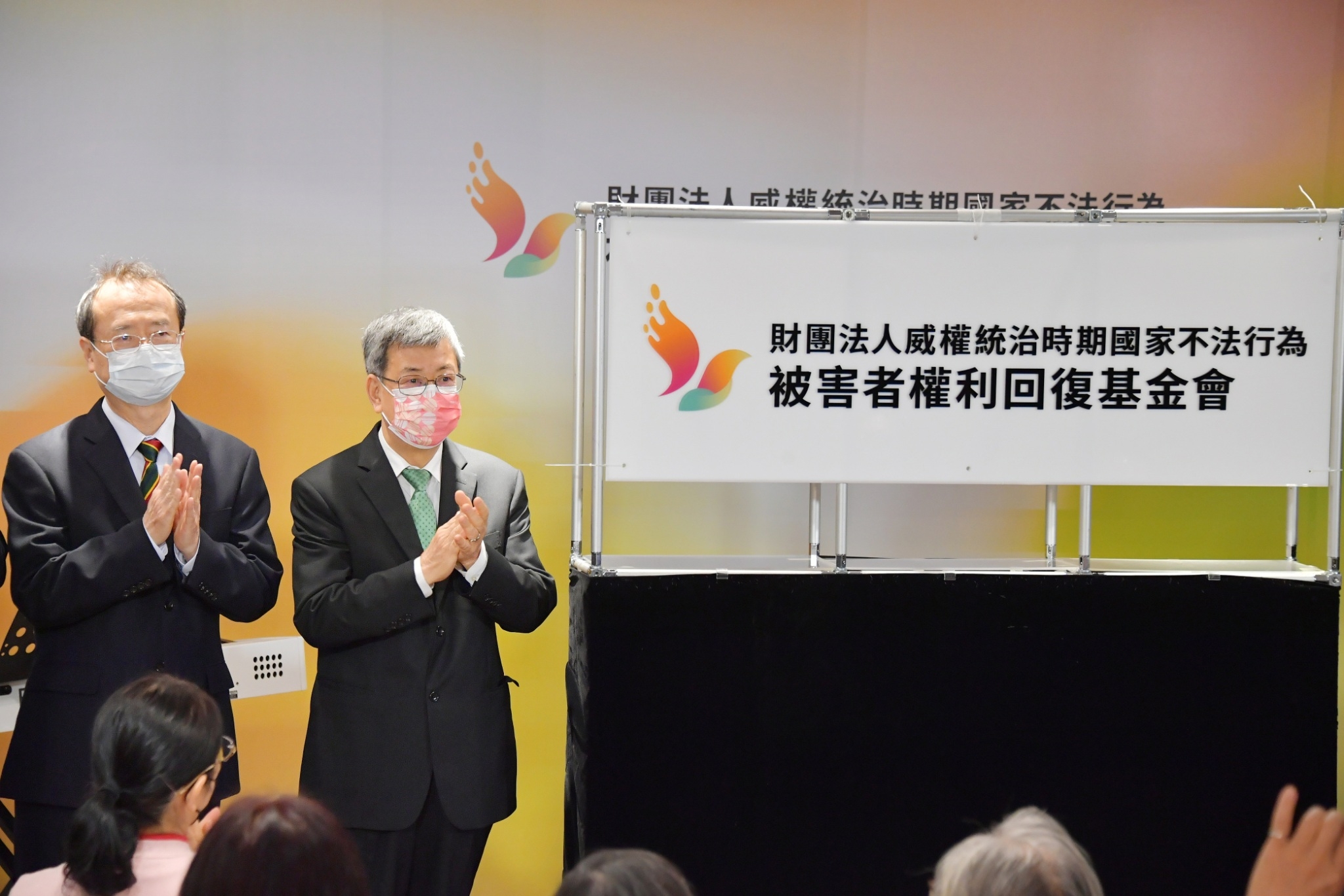 致詞結束後,陳建仁院長與現場貴賓一同赴臺前,並拉下綵帶,為財團法人威權統治時期國家不法行為被害者權利回復基金會完成揭牌儀式。該基金會標誌設計採用燭火與翅膀的視覺形象,以溫暖的手擁抱象徵自由的鴿子,並承載歷史與傷痛,而展開的雙翼如同翻開歷史新頁。