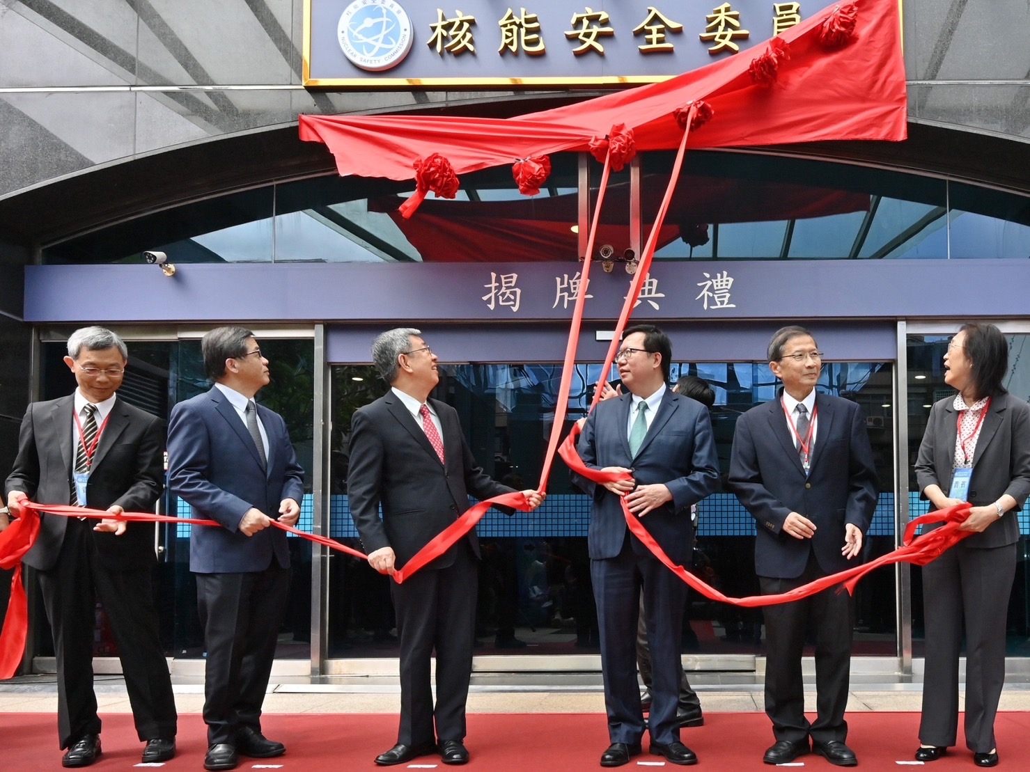 陳院長到場後,手持「核能安全委員會NUCLEAR SAFETY COMMISSION」手板和與會者大合照,隨後頒發布達令,並將印信交予核安會新任主委陳東陽。致詞結束後,院長與鄭文燦副院長、李孟諺秘書長、核安會陳東陽主委、張欣副主委及行政院人事總處李秉洲副人事長至核安會大樓正門,手持紅繩揭下紅布,完成揭牌儀式。