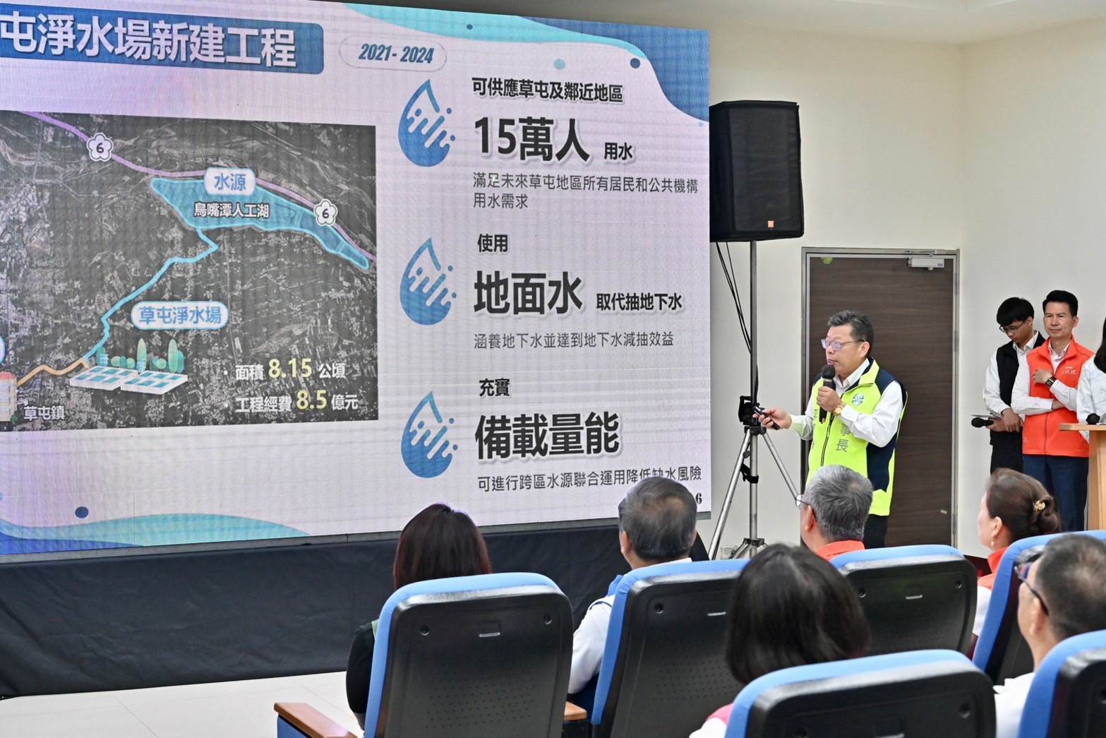 陳院長指出,過去臺灣部分地區因超抽地下水,造成地層下陷,不僅導致容易淹水致災,也影響沿線高鐵的營運。為此,政府核定「雲彰地區地層下陷具體解決方案暨行動計畫」加以因應,「烏溪鳥嘴潭人工湖計畫」即為其中重大建設之一,而「草屯淨水場」亦為該人工湖計畫的一環。