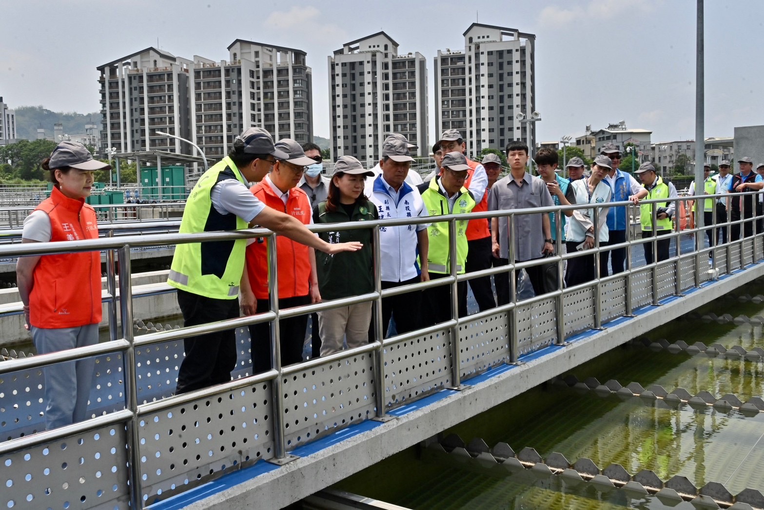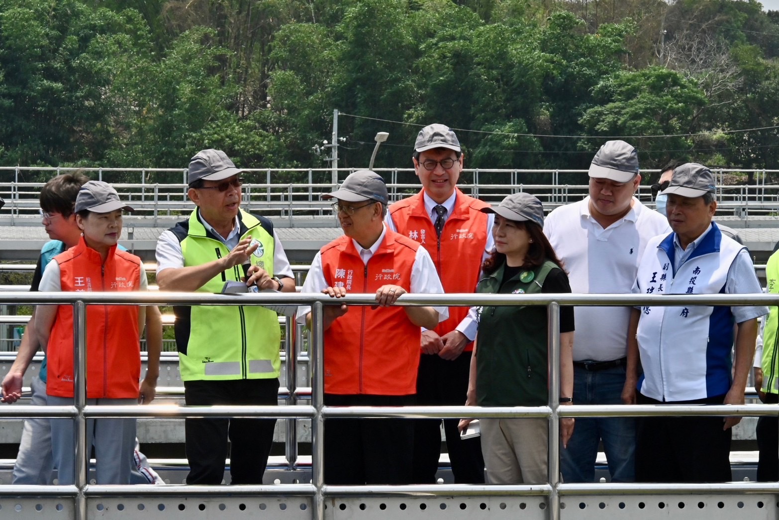此行,陳院長抵達後,首先聽取台水公司李嘉榮董事長說明草屯淨水場新建工程簡介;致詞結束後,院長與行政院林子倫發言人、經濟部王美花部長、經濟部水利署賴建信署長、台水公司李董事長、馬文君立委、游顥立委、羅美玲立委、南投縣王瑞德副縣長等人步行至沉澱池進行現地視察,在台水公司王傳政總工程師解說下,了解各池體單元運作情形及其效益。