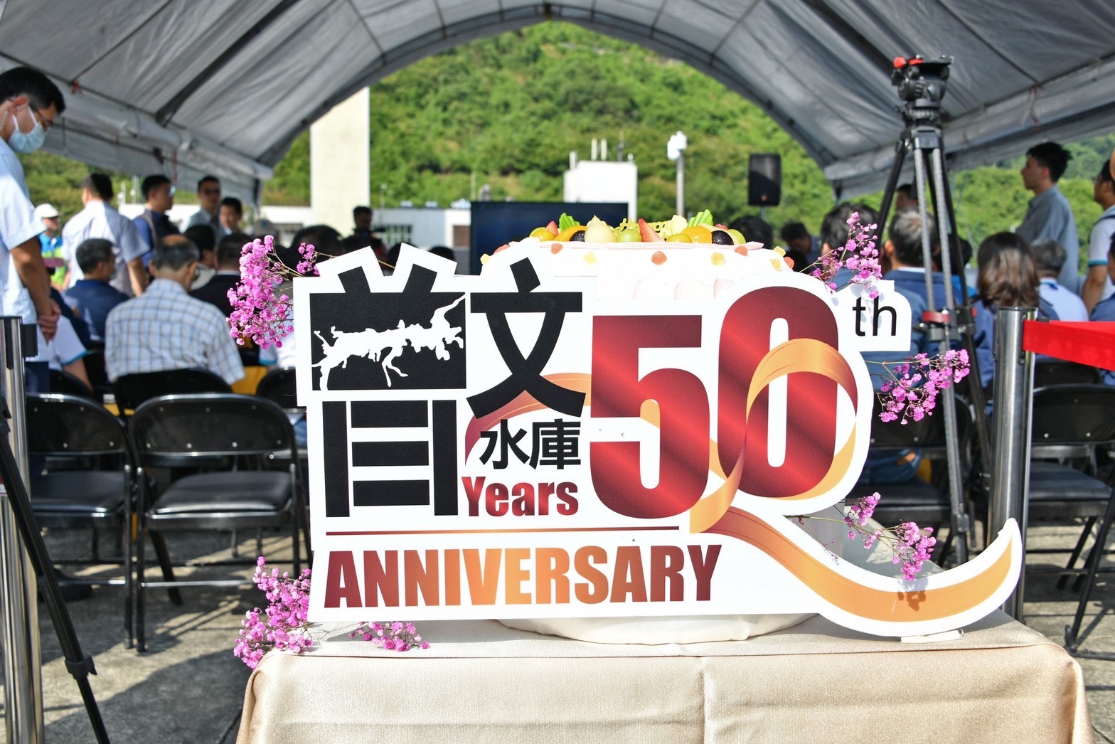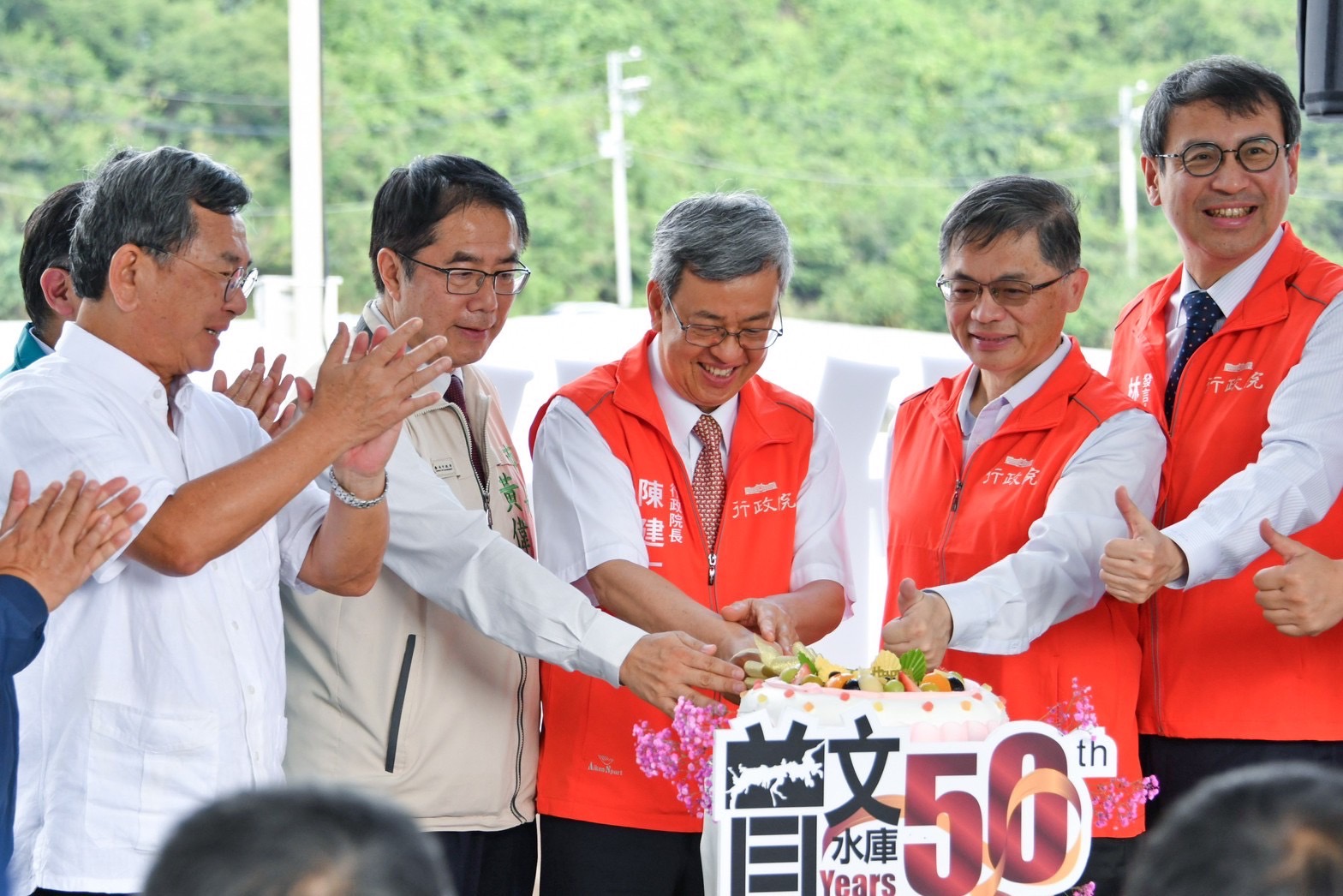 此行,陳院長先前往嘉義縣大埔鄉曾文水庫的大壩紀念碑,聽取經濟部水利署賴建信署長簡報「細說曾文五十」後,與行政院李孟諺秘書長、林子倫發言人、雲嘉南區聯合服務中心李碧菁副執行長、經濟部曾文生次長、水利署賴署長、陳明文立委、臺南市黃偉哲市長、嘉義縣劉培東副縣長、台灣自來水公司李嘉榮董事長等貴賓共同喊出「曾文五十 生日快樂」,並一同切蛋糕祝賀。隨後,院長前往曾文南化聯通管工程工區視察,由賴署長簡報「曾文南化聯通管工程計畫」。