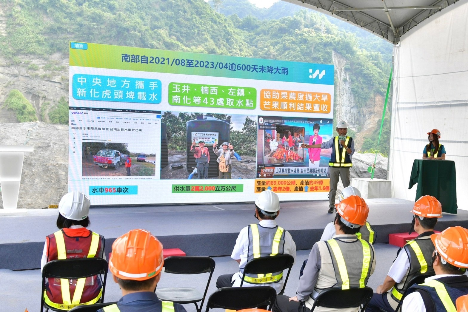 行政院長陳建仁今(29)日分別前往嘉義縣及臺南市出席「曾文五十 代代永續」曾文水庫50週年慶開幕式及視察「曾文南化聯通管工程計畫」。院長表示,曾文水庫完工啟用50週年,在一代接一代優秀水利工程師的努力下,完善南臺灣的供水系統,尤其臺灣工程師以獨創的「象鼻鋼管工法」,完成防淤隧道,有效減少水庫淤積。此外,曾文南化聯通管工程目前進度超前,預計於明(2024)年6月底提前完工,屆時將串聯曾文、烏山頭與南化等水庫及高屏攔河堰,連結成美麗的珍珠串,不僅讓嘉義、臺南及高雄等地供水無虞,也讓臺灣水利工程更具韌性。
