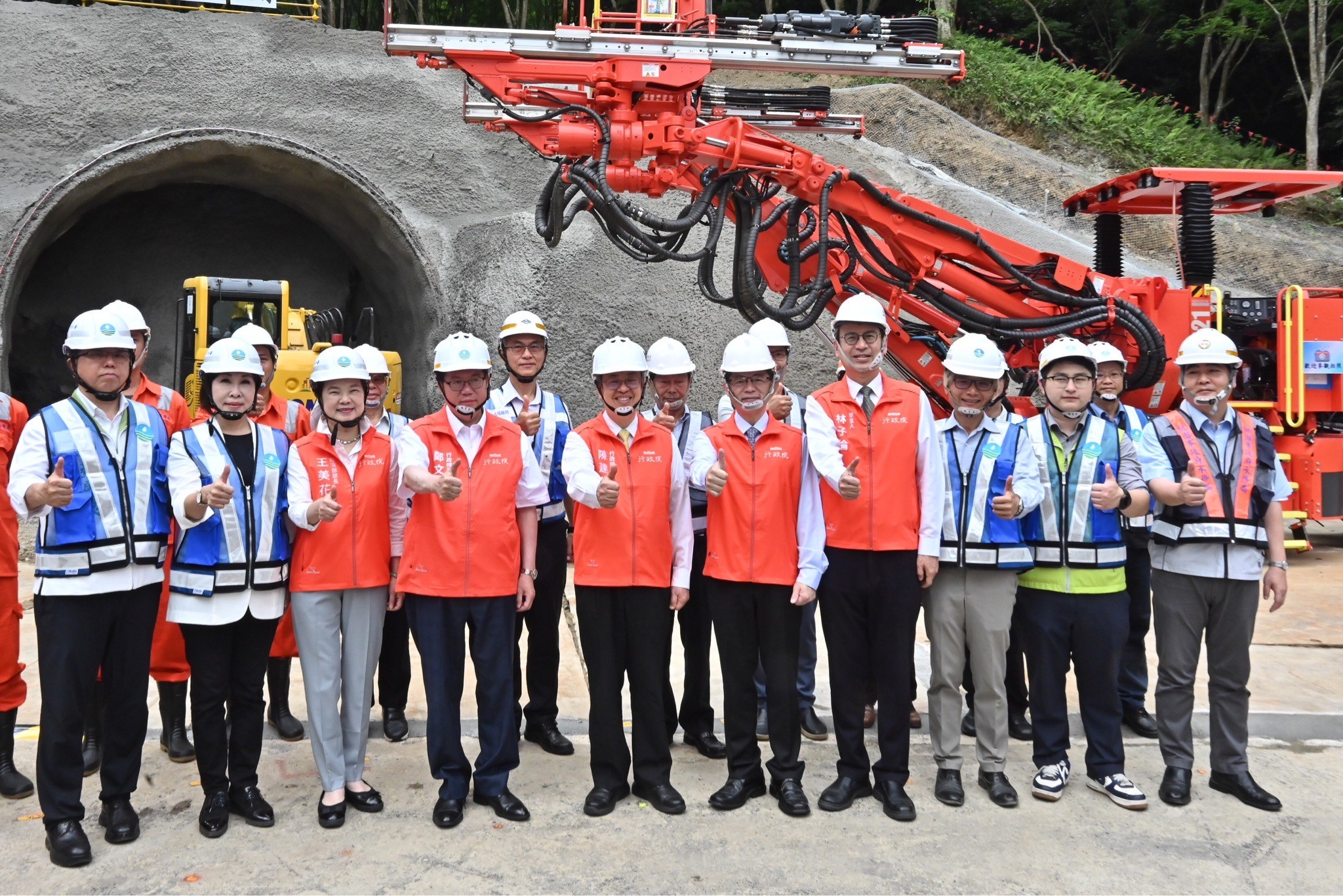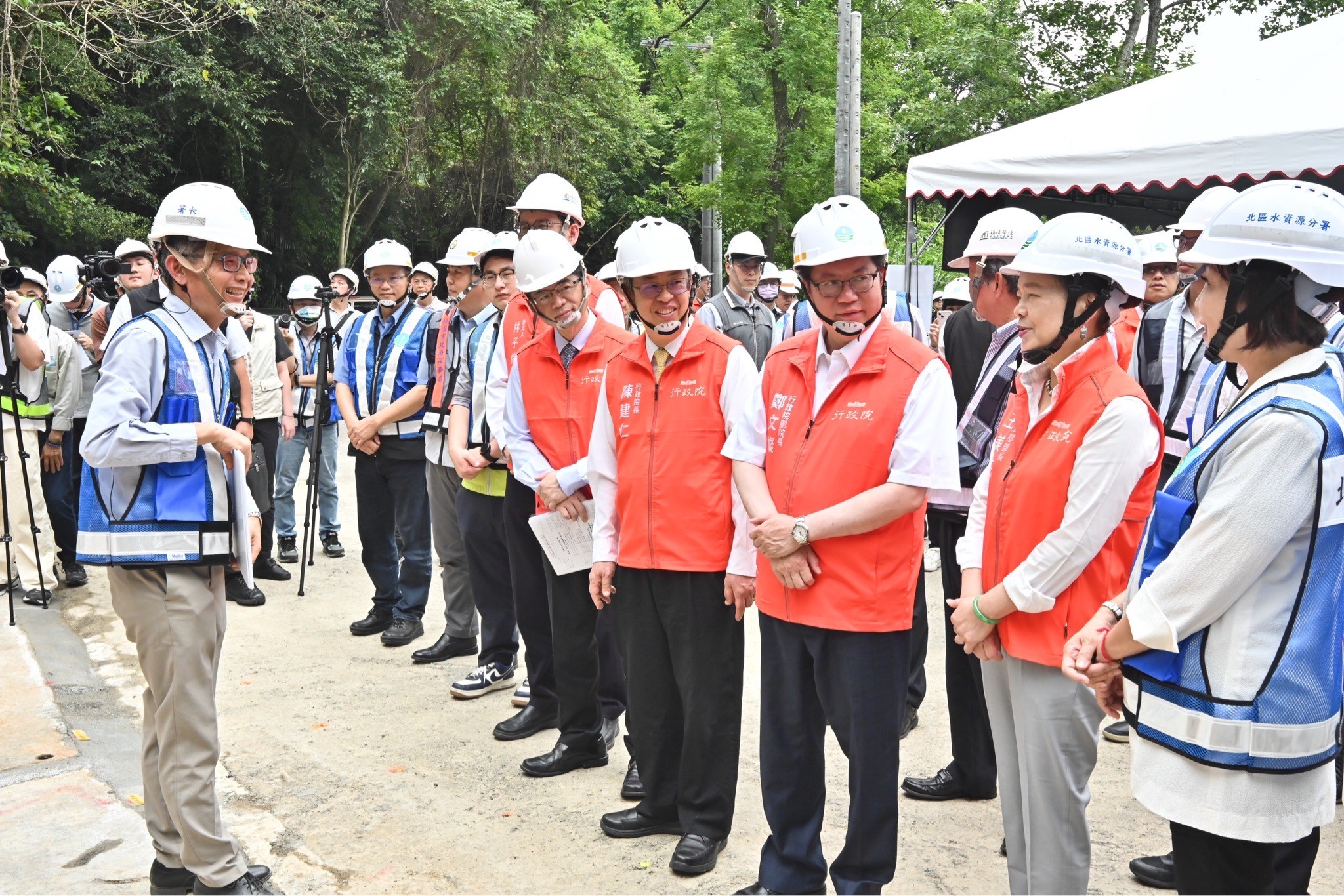 陳院長到場後,首先聽取經濟部水利署賴建信署長說明「石門水庫至新竹聯通管工程計畫」簡報;致詞結束後,陳院長偕同行政院鄭文燦副院長、李孟諺秘書長、林子倫發言人、經濟部王美花部長、水利署賴建信署長、北區水資源分署江明郎分署長、呂玉玲立委及桃園市政府水務局劉振宇局長等人進行現地視察,了解相關機具及管線等設備的使用情形,隨後一同合影留念。