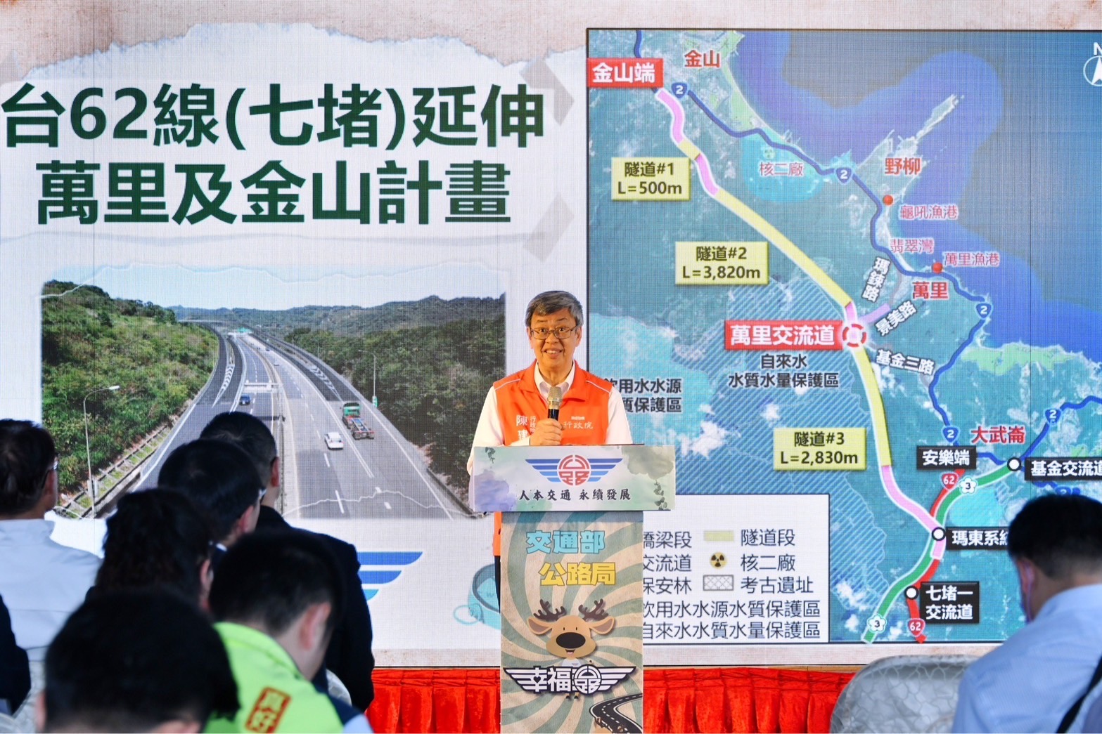 陳院長指出,提供民眾安全、舒適、便捷的交通服務,一向是政府施政的重要目標,中央也與地方政府攜手合作,積極推動「環島高、快速公路網」的串連與發展,盼能實現臺灣一日生活圈的目標。院長說,為促進北臺灣觀光旅行的發展,需要有完善的交通運輸系統配合,目前台2線基金二路於假日期間經常壅塞,對於萬里、金山地區的產業與觀光發展帶來若干影響,而藉由「台62線(七堵)延伸萬里及金山計畫」的推動,將有助於擴大高快速公路系統的服務範圍,提升整體交通路網服務。