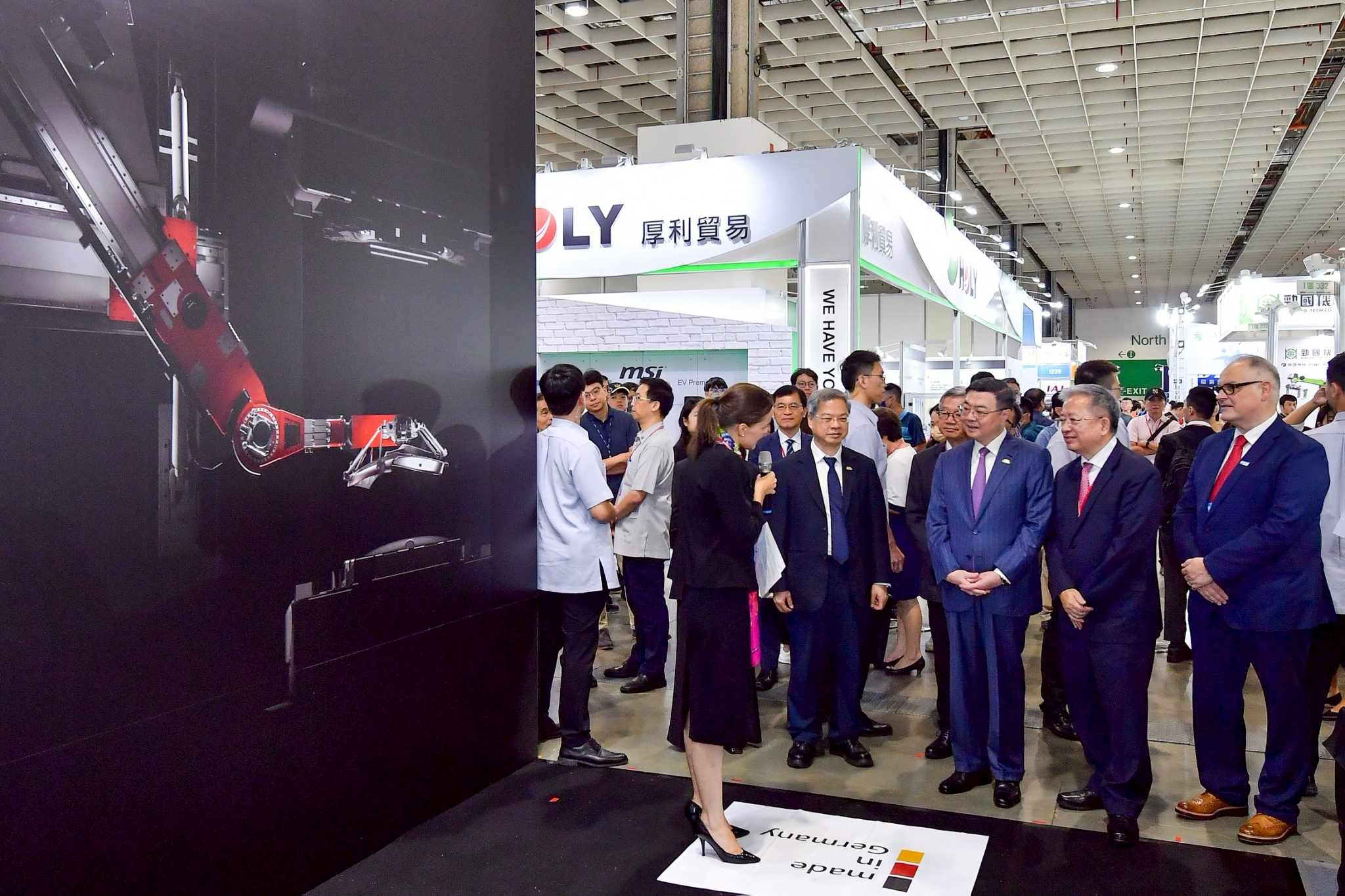 卓院長抵達後,首先接受「台灣智慧自動化與機器人協會」絲國一理事長致贈「智慧製造及智慧服務白皮書」,並與陳政興、李昌鴻副理事長共持白皮書合影。致詞結束後,卓院長偕同行政院龔明鑫秘書長、吳誠文政委兼國科會主委、李慧芝發言人、經濟部何晉滄次長、國家發展委員會詹方冠副主委、勞動部黃玲娜次長等人,以及美國、日本、德國、捷克、以色列、比利時、立陶宛、奈及利亞、索馬利蘭、瓜地馬拉、南非、印度、馬來西亞等國政商界代表一同為活動剪綵開幕及合影留念。隨後,卓院長前往參觀德國館展區、寶元數控集團、上銀集團展區及均豪精密公司,瞭解自動化生產系統及人工智慧相關技術應用概況。
