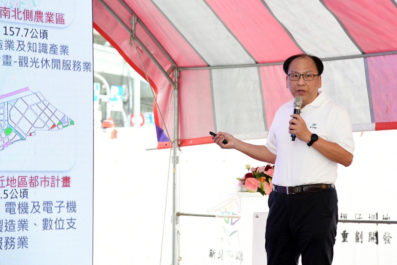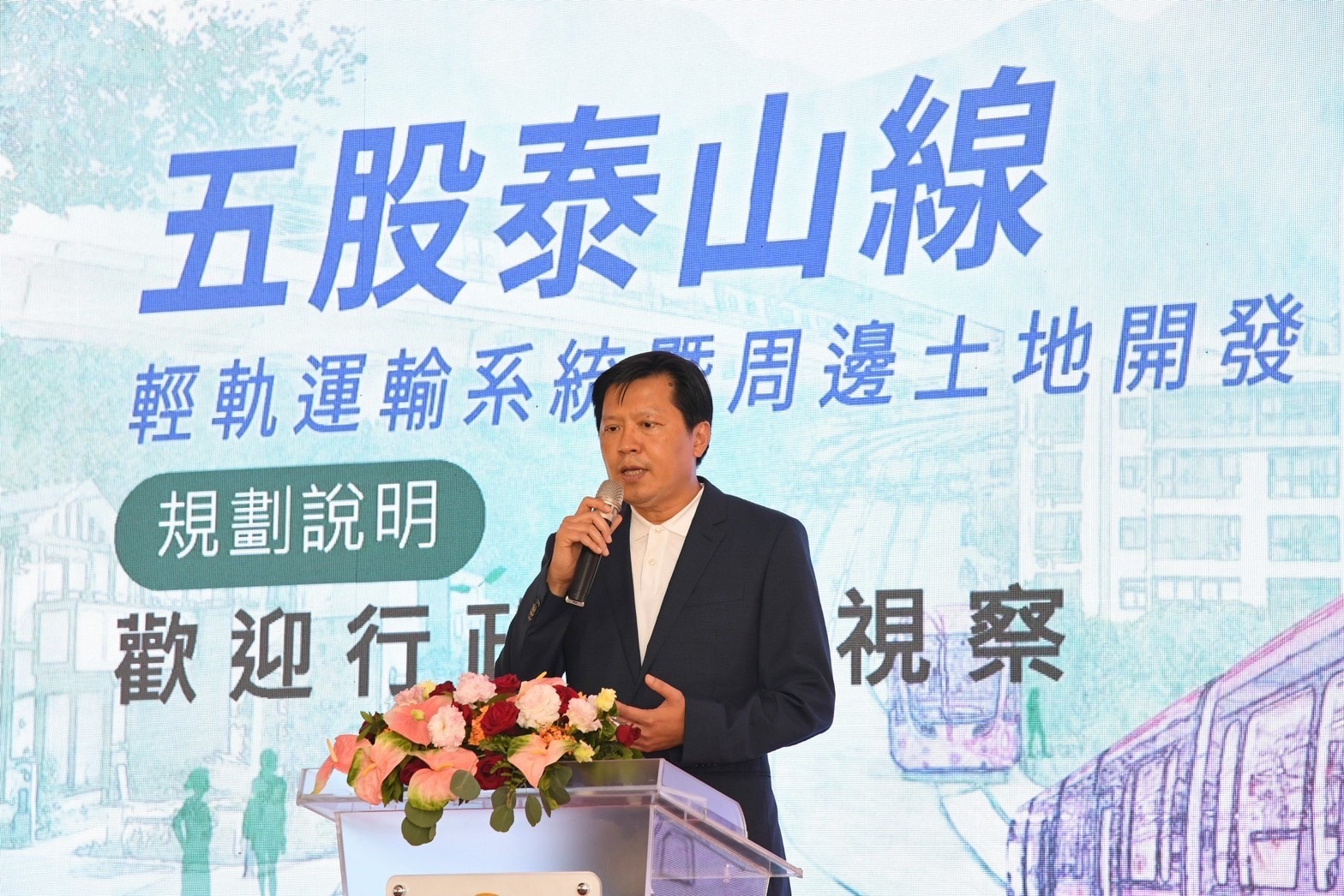 陳院長到場後先觀賞影片介紹五股泰山輕軌路線規劃,並聽取新北市政府捷運工程局李政安局長簡報「五股泰山線輕軌運輸系統暨周邊土地開發規劃說明」。致詞結束後,陳院長與現場貴賓一同合影留念,並前往桃園機場捷運A5泰山站2樓,由李局長進行解說,了解五股泰山輕軌路線位置,以及與機場捷運銜接情形。