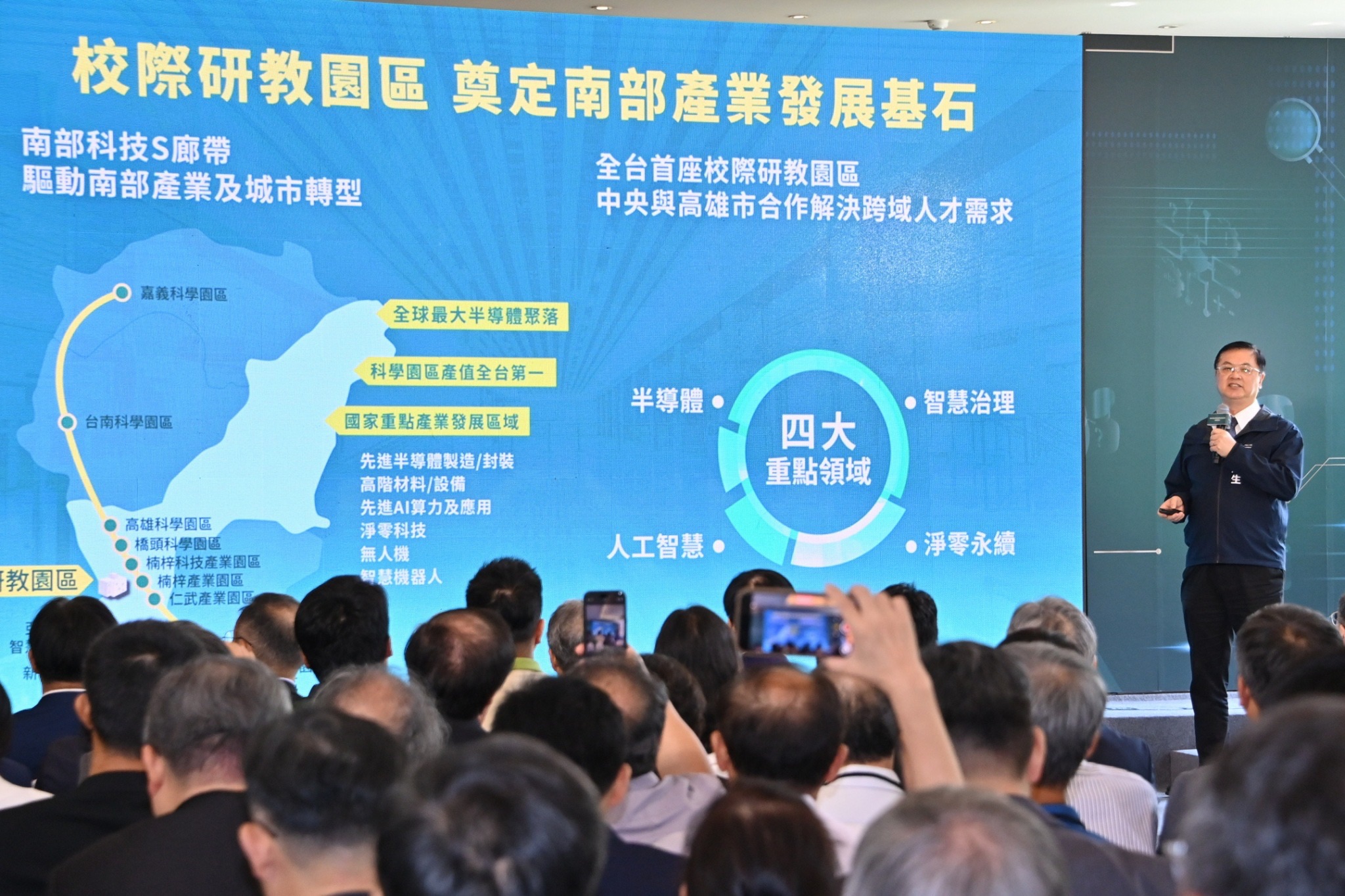 行政院長卓榮泰今(4)日赴高雄市左營區,出席「國家重點領域校際研教園區」啟動儀式時表示,政府未來5年將投入132億元建設園區,由國立陽明交通大學、國立清華大學兩校常駐,並結合38所南部大專院校校際合作,使該園區為「大南方新矽谷」及高雄市注入人才培育及產業發展,特別是在半導體、人工智慧、淨零碳排與智慧城市等重點產業,使之與「桃竹苗大矽谷」成為臺灣取得全球領先關鍵地位的雙引擎,帶動國家科技更向上發展。