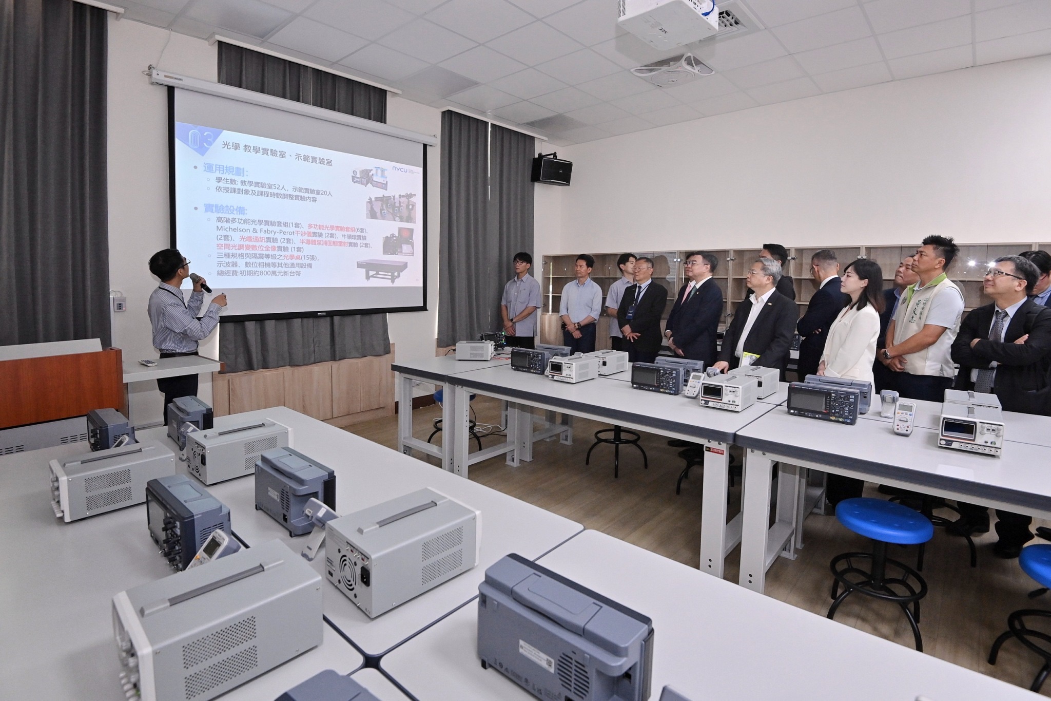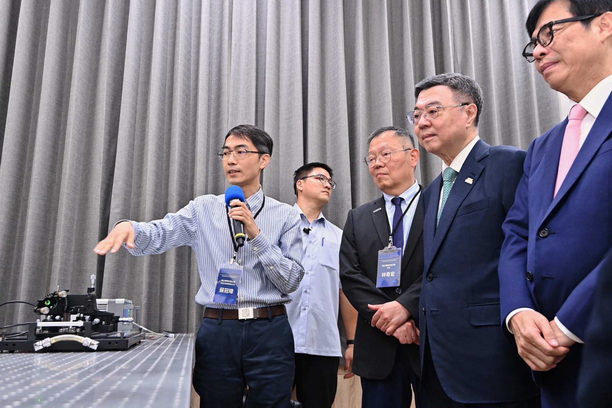此行,卓院長抵達現場後,首先聽取高雄市羅達生副市長說明園區規劃與願景。致詞結束後,院長與行政院龔明鑫秘書長、李慧芝發言人、南部聯合服務中心許乃文執行長、教育部朱俊彰次長、國家發展委員會詹方冠副主委、高雄市陳其邁市長、李柏毅立委、國立陽明交通大學林奇宏校長、國立清華大學高為元校長、財團法人臺南市致遠基金會施振榮董事長等貴賓,共同完成啟動儀式。最後,卓院長在林壽煦副教授、蘇冠暐教授導覽下,參觀陽明交大電子學實驗室及光學實驗室。