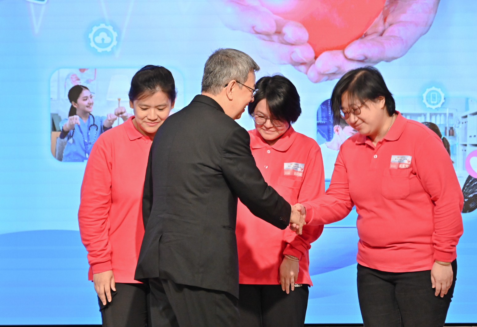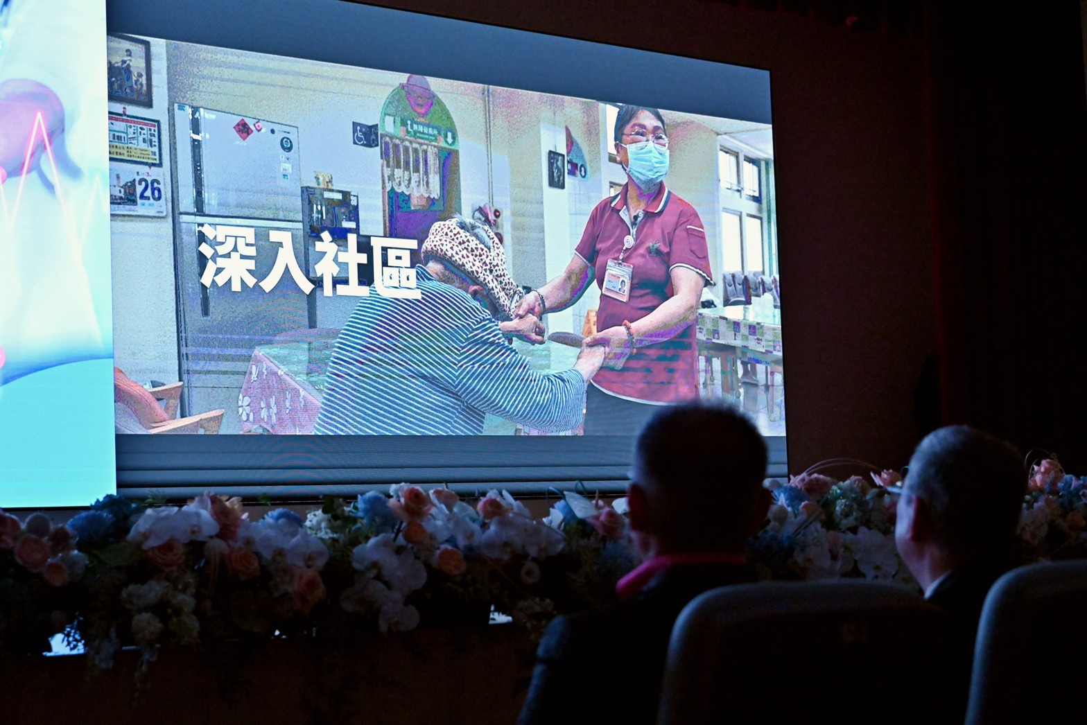 此行,陳院長到場後,首先欣賞頒獎典禮開場影片;致詞結束後,院長頒發團體獎金獎匾額「守護愛滋 藥愛無礙」予臺北市立聯合醫院昆明防治中心愛滋病防治組,並與得獎團隊成員合影留念。