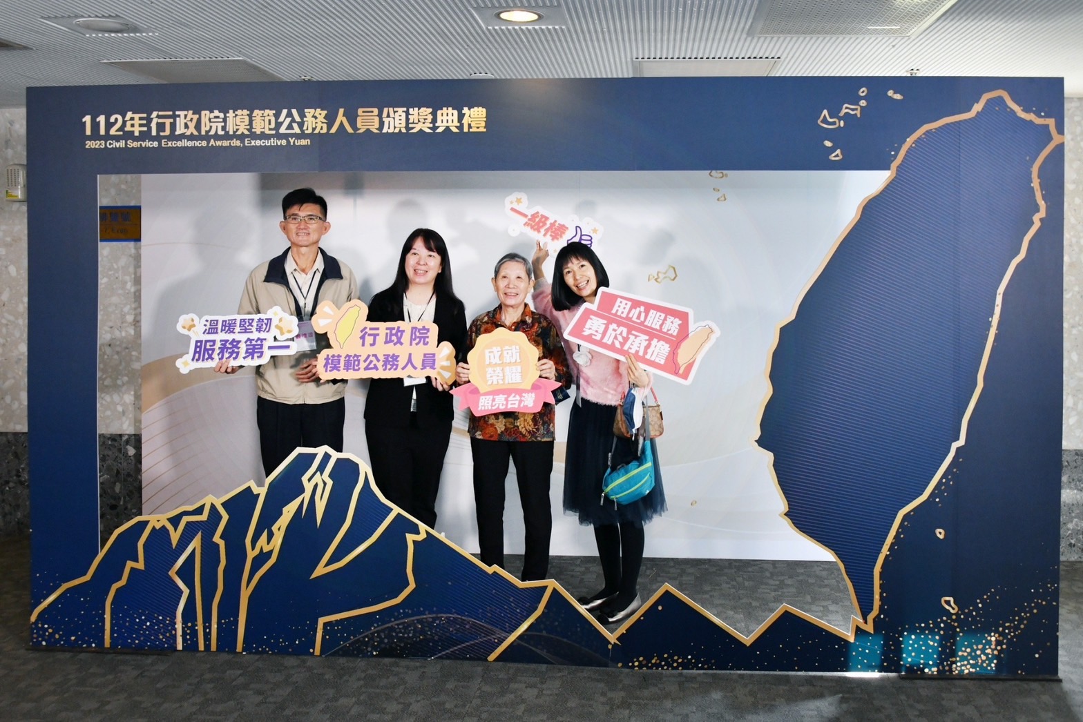 陳院長指出,政府相當重視公務人員身心健康,在秉持友善職場精神下,自110年起各主管機關致力打造多元且溫馨的工作環境,重視同仁需求並提供相應服務,包括:審酌多元性別、身心障礙同仁、超時加班同仁等需求,提供友善及支持措施,並強化關懷同仁身心健康相關資源的運用,使公務同仁能以健康身心投入工作,提升服務效能。隨後,院長逐一頒發獎座予模範公務人員,並與得獎者親友、同事一同合影留念。