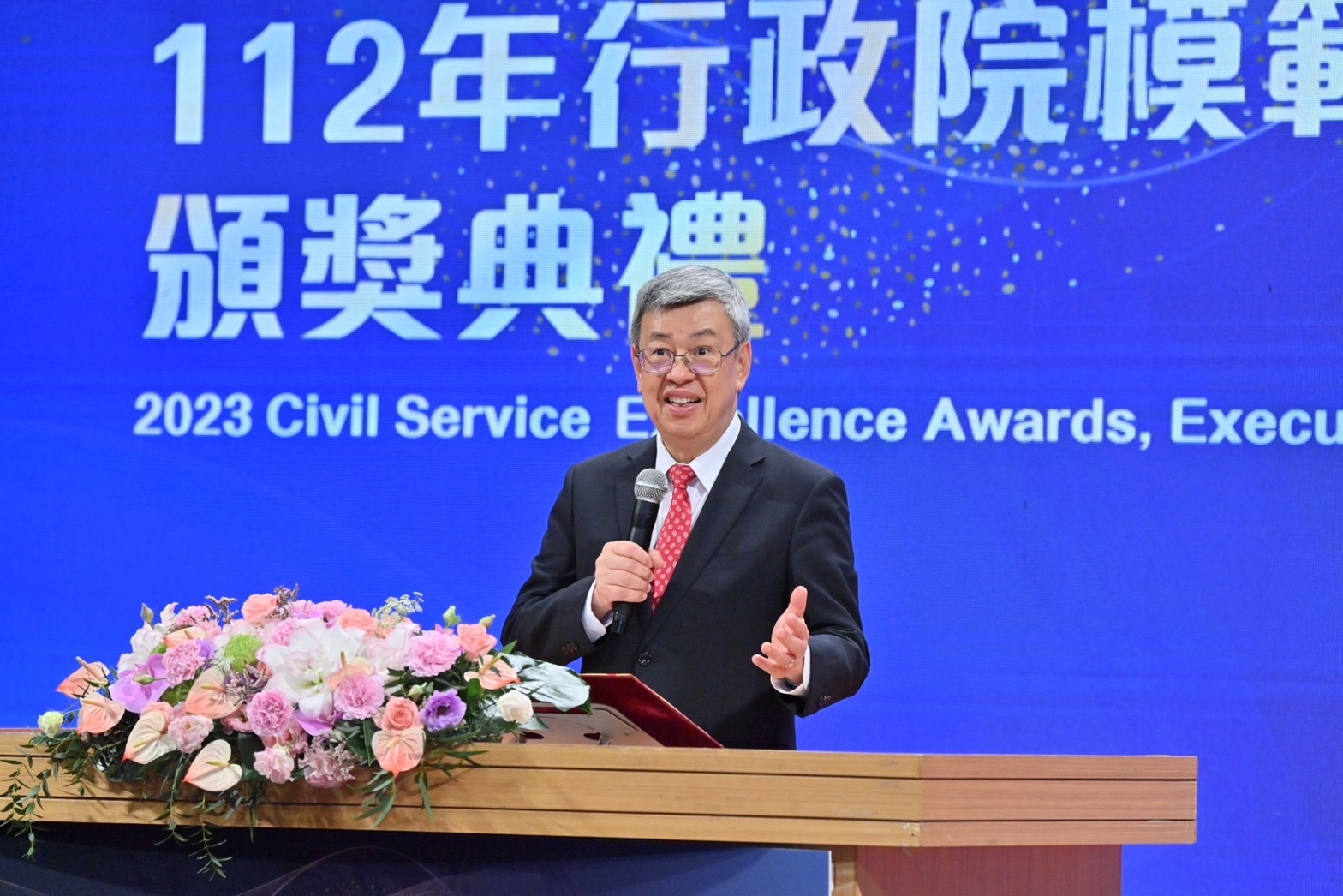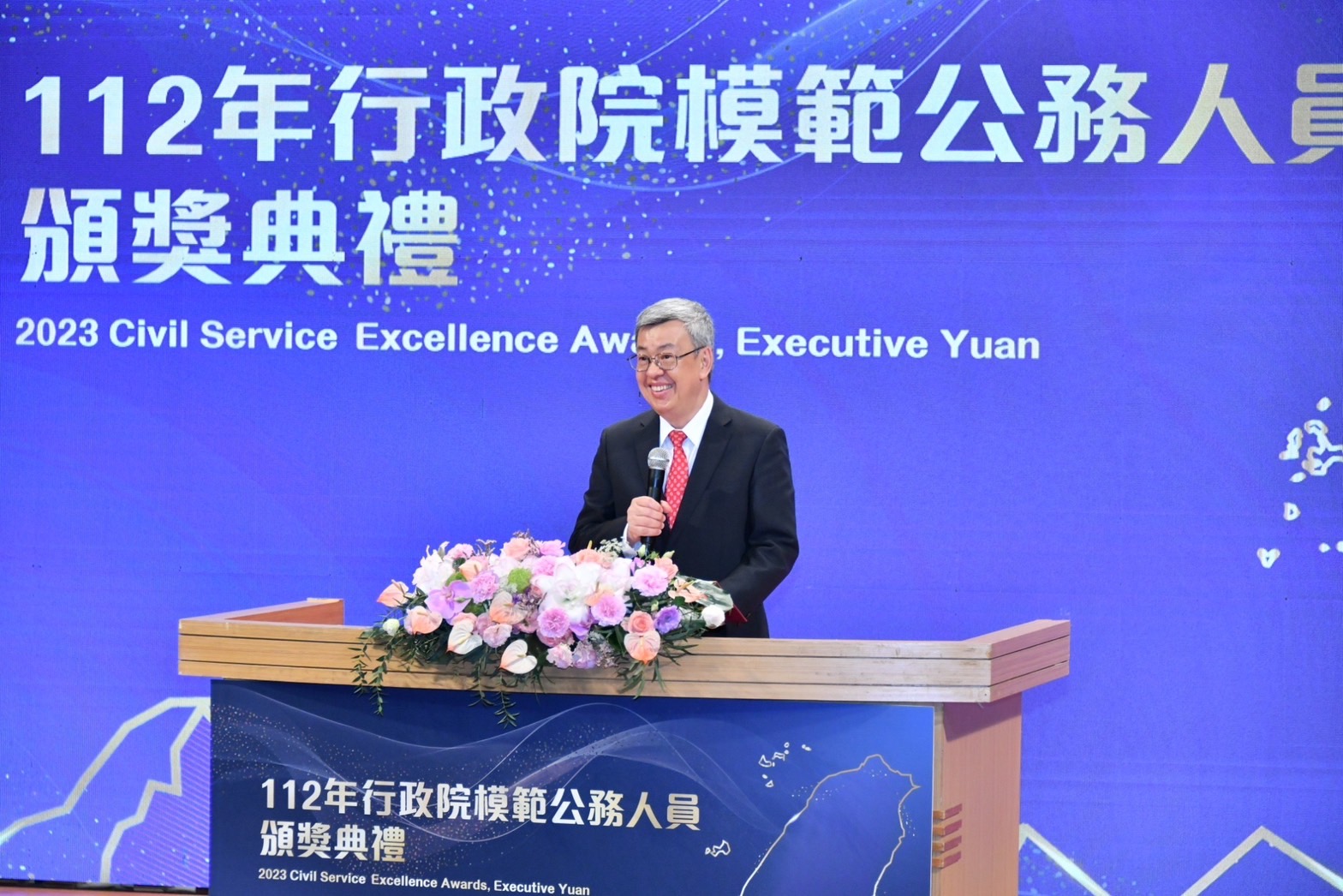 行政院長陳建仁今(23)日出席「112年行政院模範公務人員頒獎典禮」,頒獎表揚得獎者在「國際事務」、「犯罪查緝」、「社會福利」、「災難搶救」與「創新服務」等領域的傑出貢獻,並期許所有得獎者持續以務實積極態度,以及為民服務的熱忱,不斷追求卓越與創新,成為所有公務人員的學習楷模。院長表示,政府相當重視公務人員薪資福利及身心健康權益,已積極從薪資調整、津貼加發、提高勤務加給等方面著手,並致力打造多元、溫馨的工作環境,提供友善及支持措施,使公務同仁能以健康身心投入工作,提升服務效能。