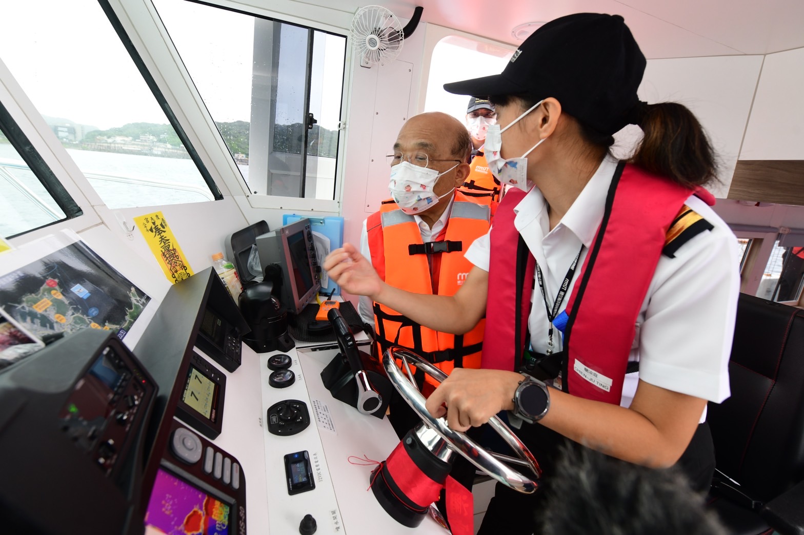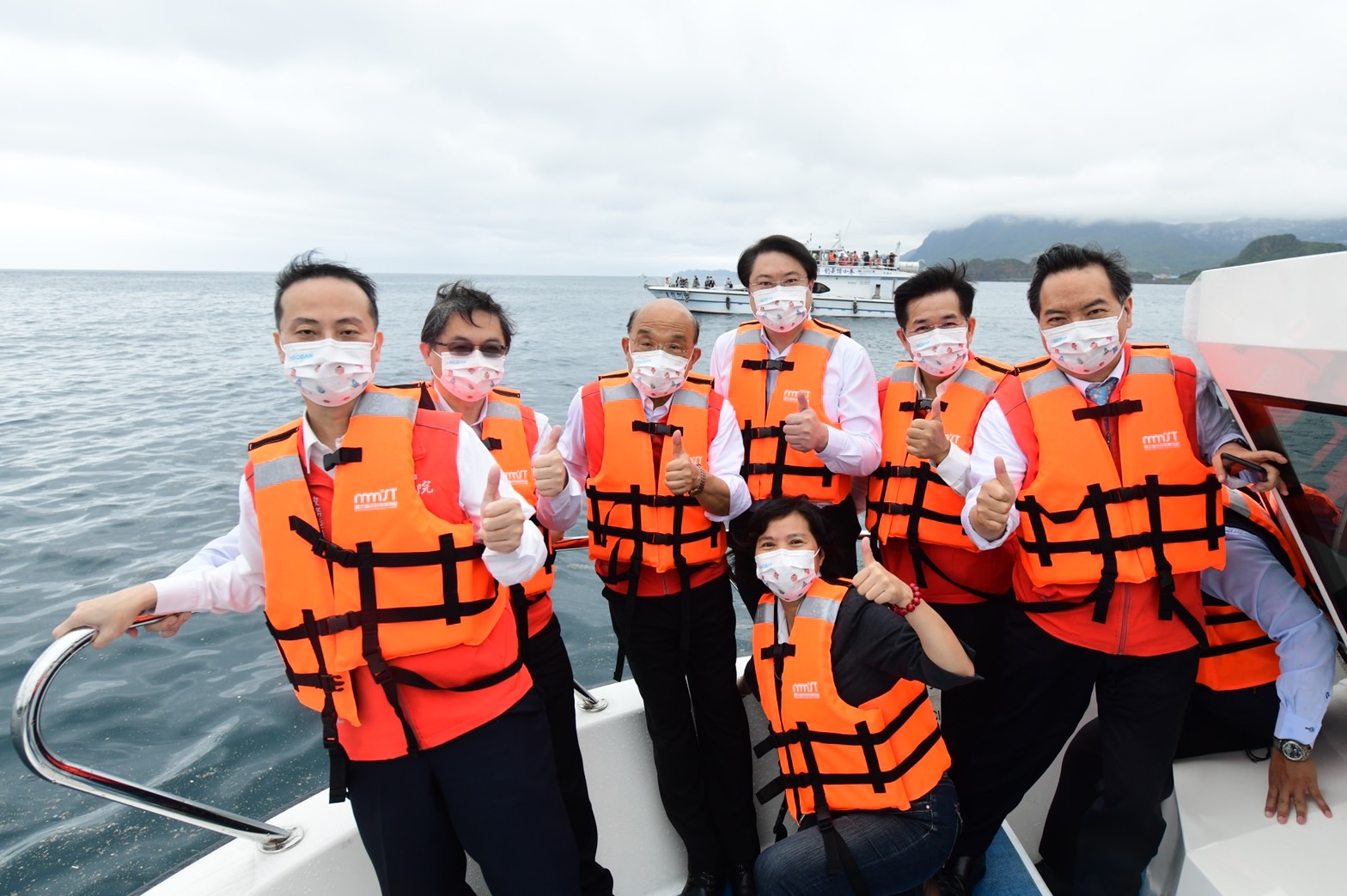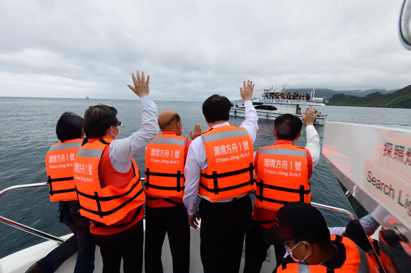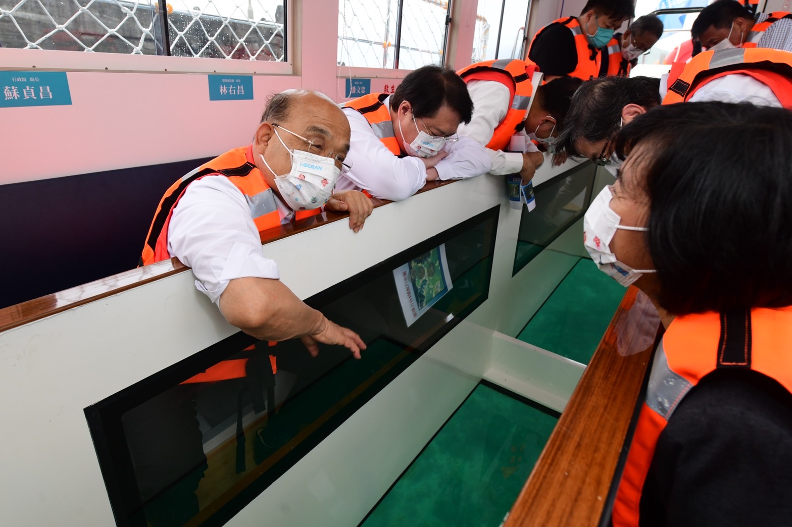 此行蘇院長與教育部長潘文忠、基隆市長林右昌等貴賓,先欣賞海科館附設大翅鯨幼兒園孩子們活潑的開幕舞蹈表演「小船長大冒險」,並與孩子們一同比讚合影留念。隨後,院長與貴賓們手持鳴笛喇叭,共同大聲鳴笛,為「潮境方舟1號」完成啟航儀式。院長並穿上救生衣,搭乘潮境方舟1號出港巡航,聽取海洋生態地景導覽,瞭解近年海洋復育成果,同時也透過船底特別打造的海底觀景窗,近距離觀看海灣生態環境。