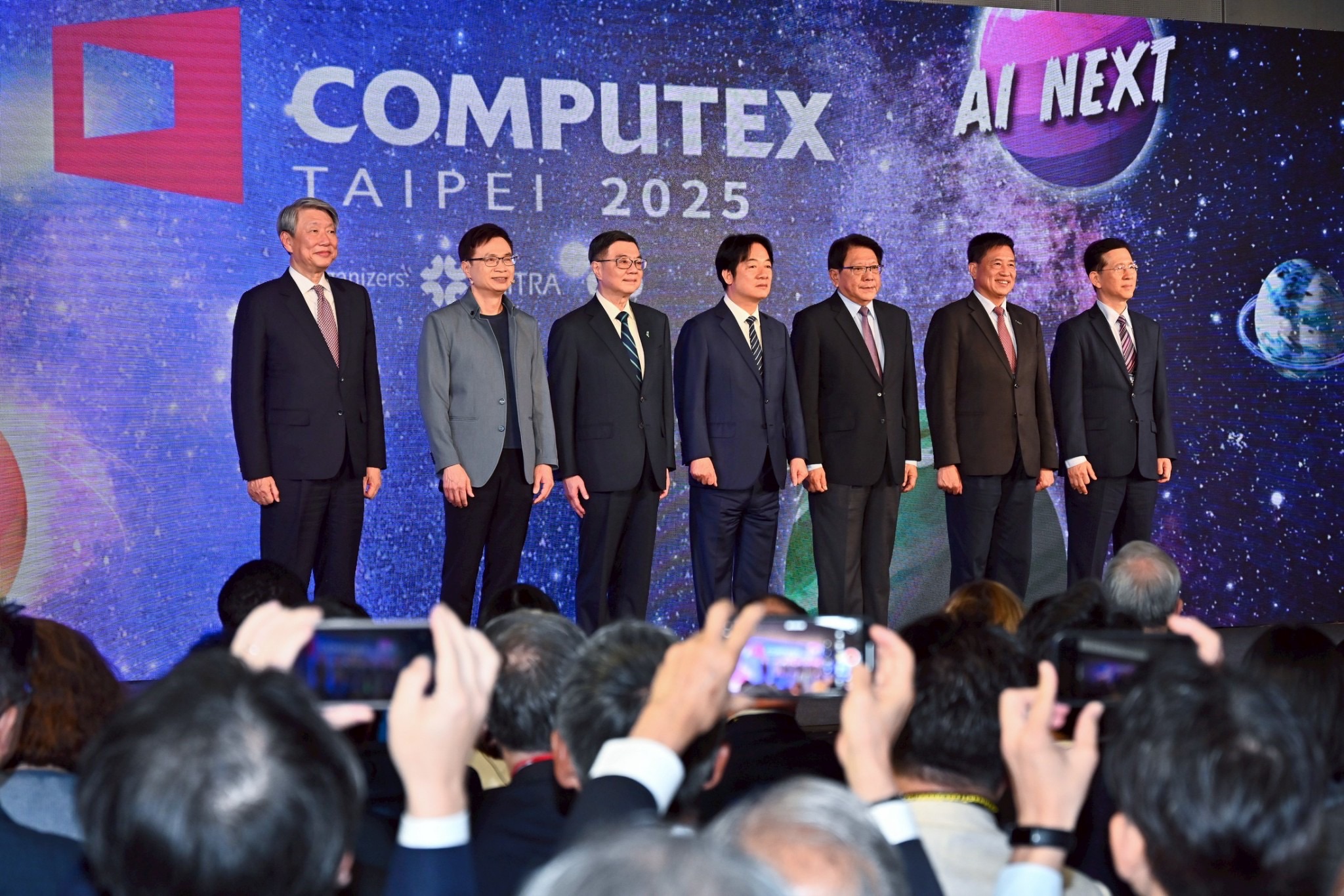 稍早,卓院長也陪同賴清德總統出席「2025台北國際電腦展(COMPUTEX)」開幕典禮,並與總統、黃志芳董事長及彭双浪理事長共同在舞臺上觸碰LED燈球,完成揭幕儀式。儀式結束後,總統、卓院長、總統府潘孟安秘書長、郭智輝部長、黃彥男部長、黃志芳董事長及彭双浪理事長一同合影。