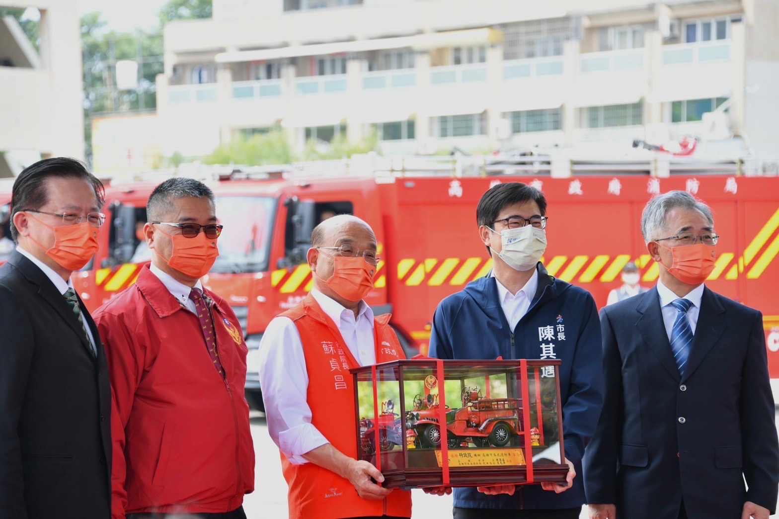 致詞結束後,院長將消防車鑰匙模型交予陳其邁市長,陳市長也回贈院長消防車模型,完成交車儀式;接著院長與現場貴賓一同輕觸魔球,開啟後方消防車輛警示燈,並降下「中央補助,地方守護,攜手共創,幸福高雄」紅布條,完成車輛啟動及揭綵儀式。隨後,院長在高雄市消防局莊淳閔分隊長的解說下,進行消防車輛巡禮導覽,實際瞭解今日交車之消防車輛種類及功能。