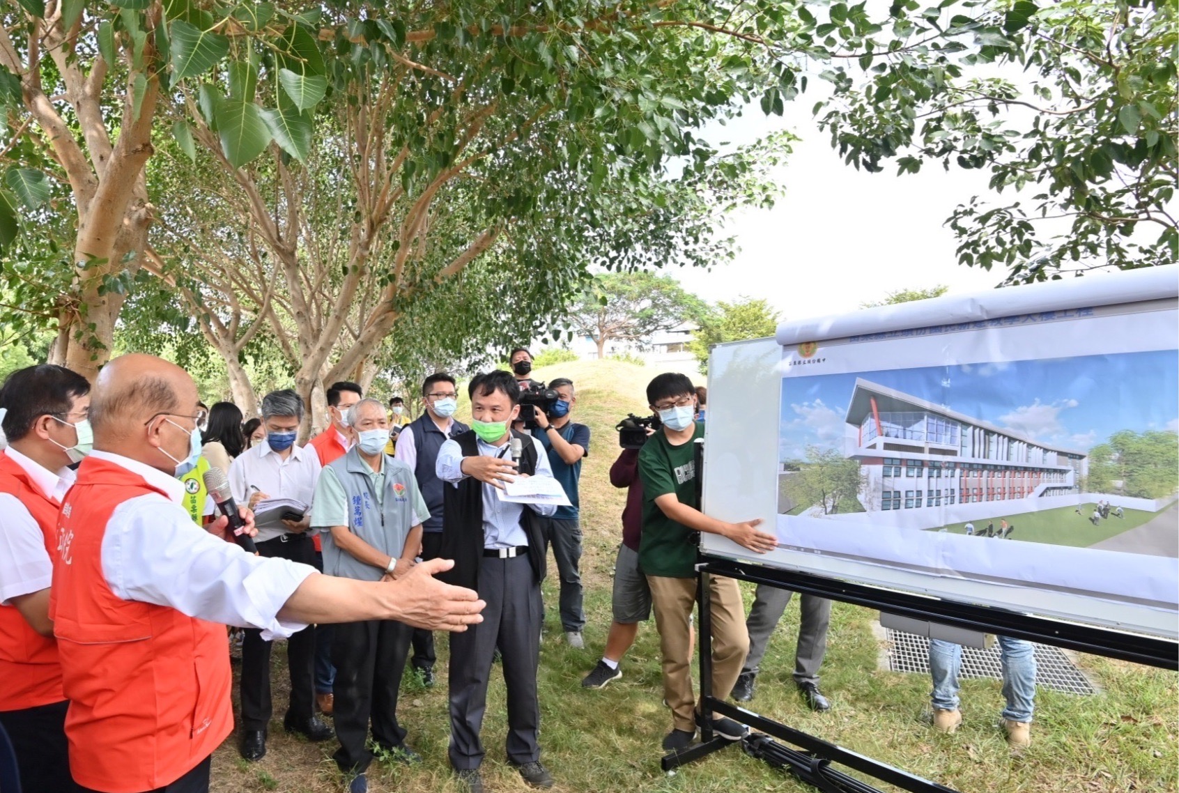 蘇院長今日視察組合屋及未來新校舍預定地,一再叮嚀校舍增建規劃配置要有利學生上下課的動線、教學,不要互相干擾。由於預定建地在馬路邊,院長並提醒校區不僅應留意樹木植栽,亦需注意噪音隔離,為孩童們建構最好的學習環境。