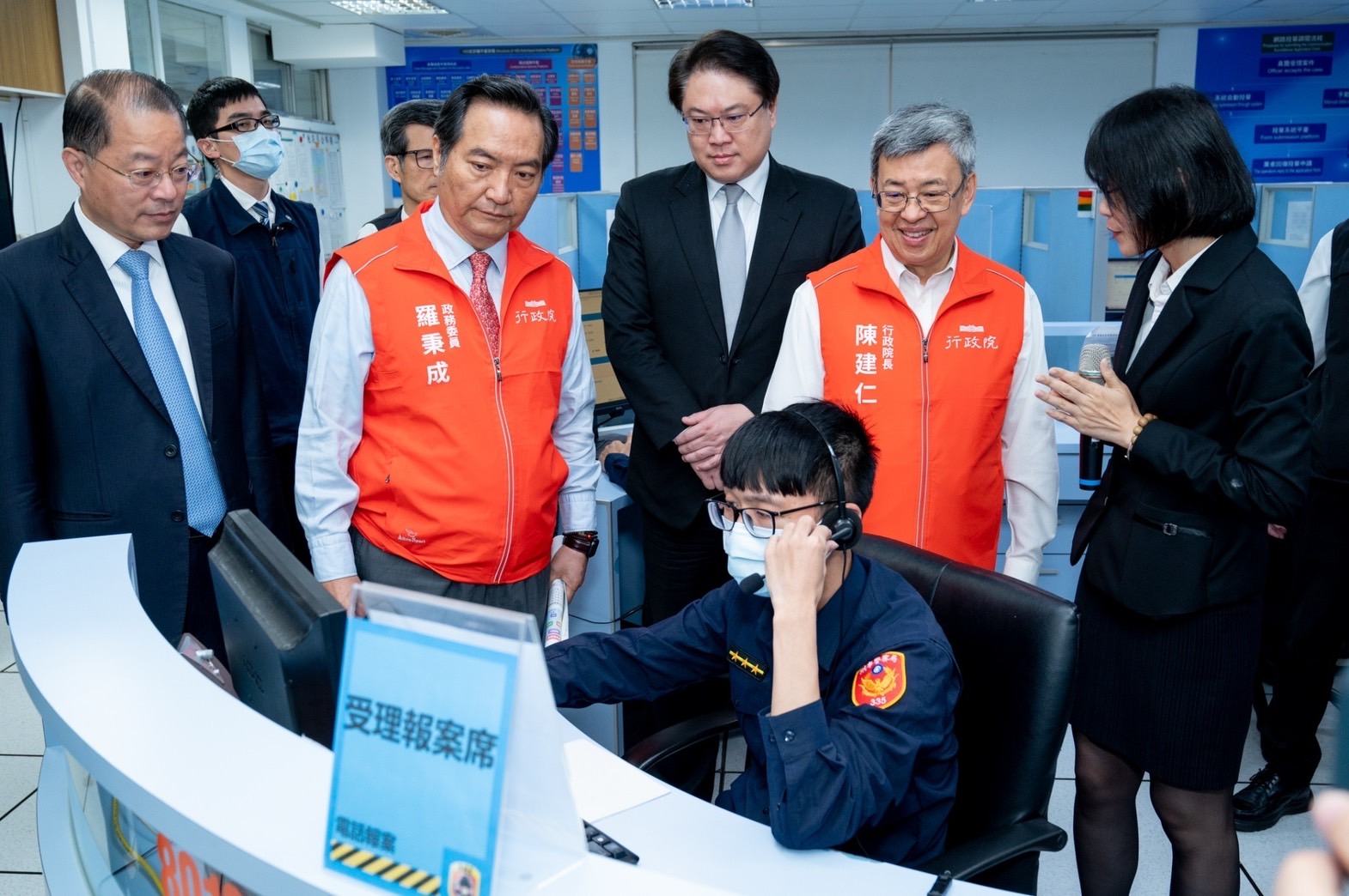 陳院長說,他今日特別前來視察165反詐騙諮詢專線,該專線自2004年設置以來,從未中斷,24小時全年無休服務國人,歷經19年的發展,累積許多反詐騙經驗和實力,並從原來成立時的諮詢性質,轉型成為現在可以受理檢舉、輔導、轉介被害案件等,同時更整合電信、金融及網路業者資源,執行攔阻工作與情資分析。