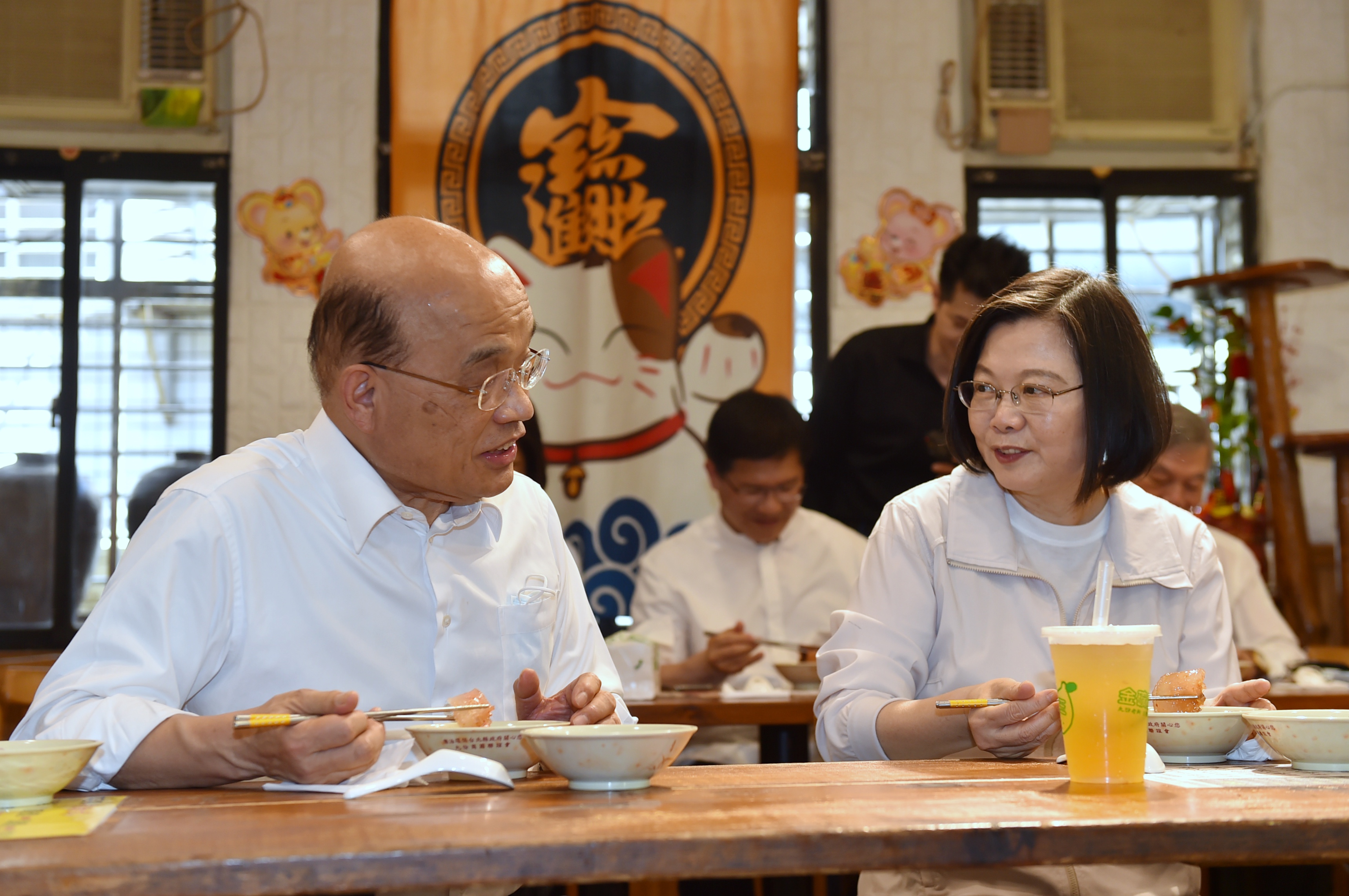 隨後,蘇院長一行前往外型神似宮崎駿動畫「神隱少女」場景的「阿妹茶樓」品茶看風景,店家準備芋棗、茶餅佐茶。茶樓負責人許立育也向總統、院長表示,政府「新南向政策」吸引許多新加坡、馬來西亞等東南亞國家觀光客來九份觀光。