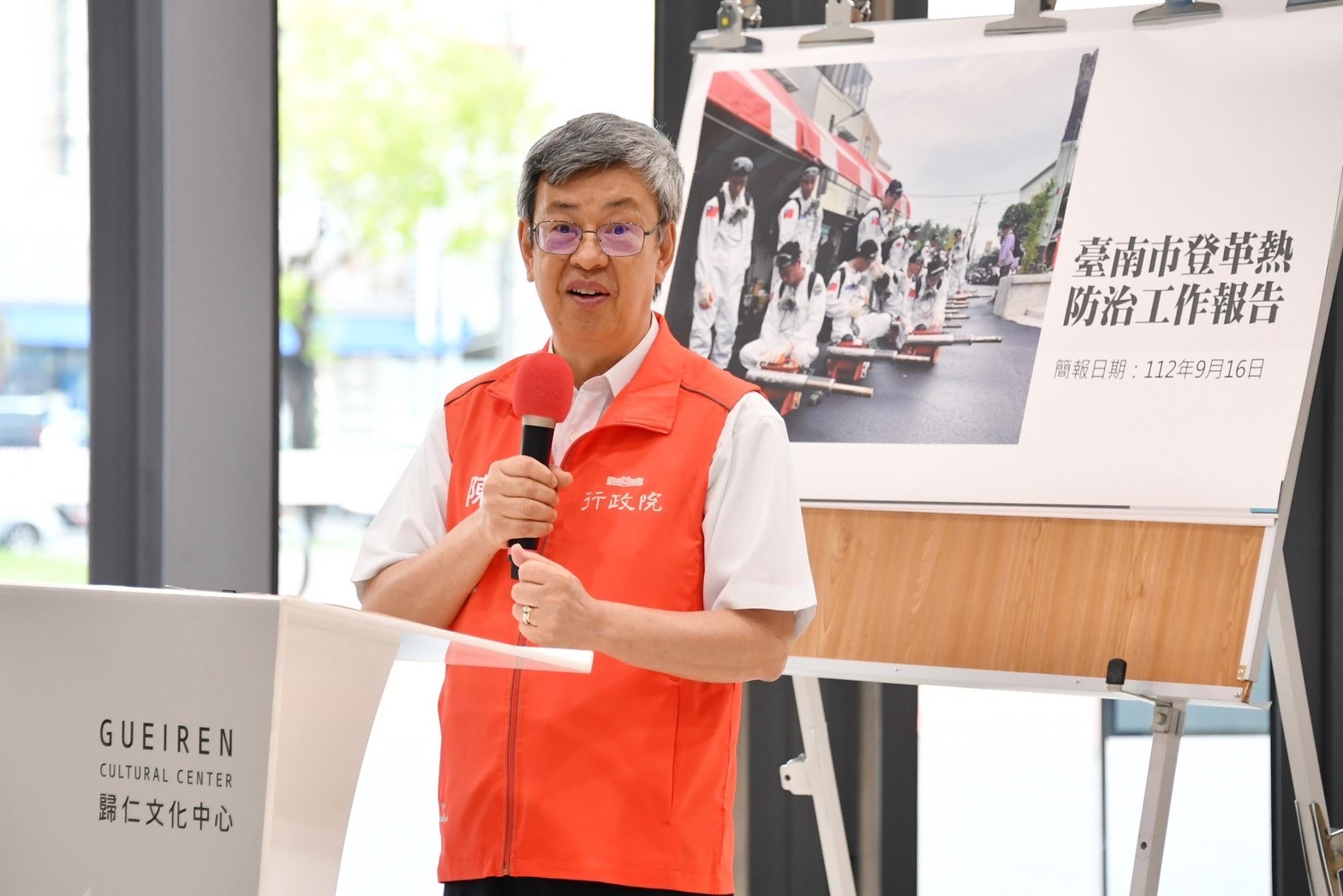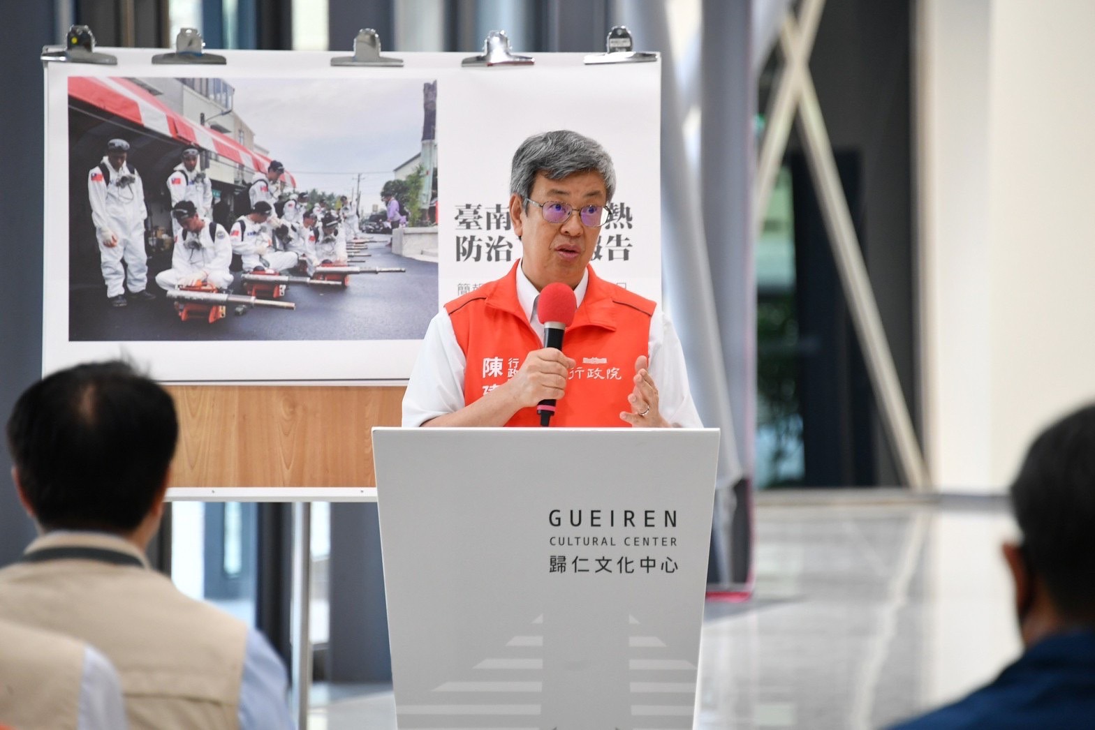 關心國內登革熱疫情,行政院長陳建仁今(16)日前往臺南市視察「中央及地方因應臺南市登革熱疫情防治工作」時表示,防治登革熱就如同COVID-19防疫一樣,需要全民攜手協力、團結一心,努力清除孳生源,才能將疫情控制好。他要感謝臺南市政府及所有參與防疫的志工、里長及在地鄉親攜手合作,中央一定會全力支持地方防疫工作及所需經費,也請各部會及所屬機關做好轄下房舍、空屋、營區的環境管理及孳生源清除工作,希望大家攜手努力,迎來疫情獲得控制的曙光。