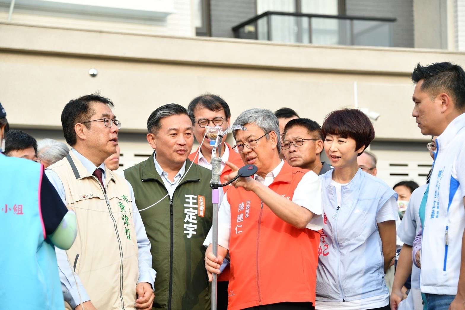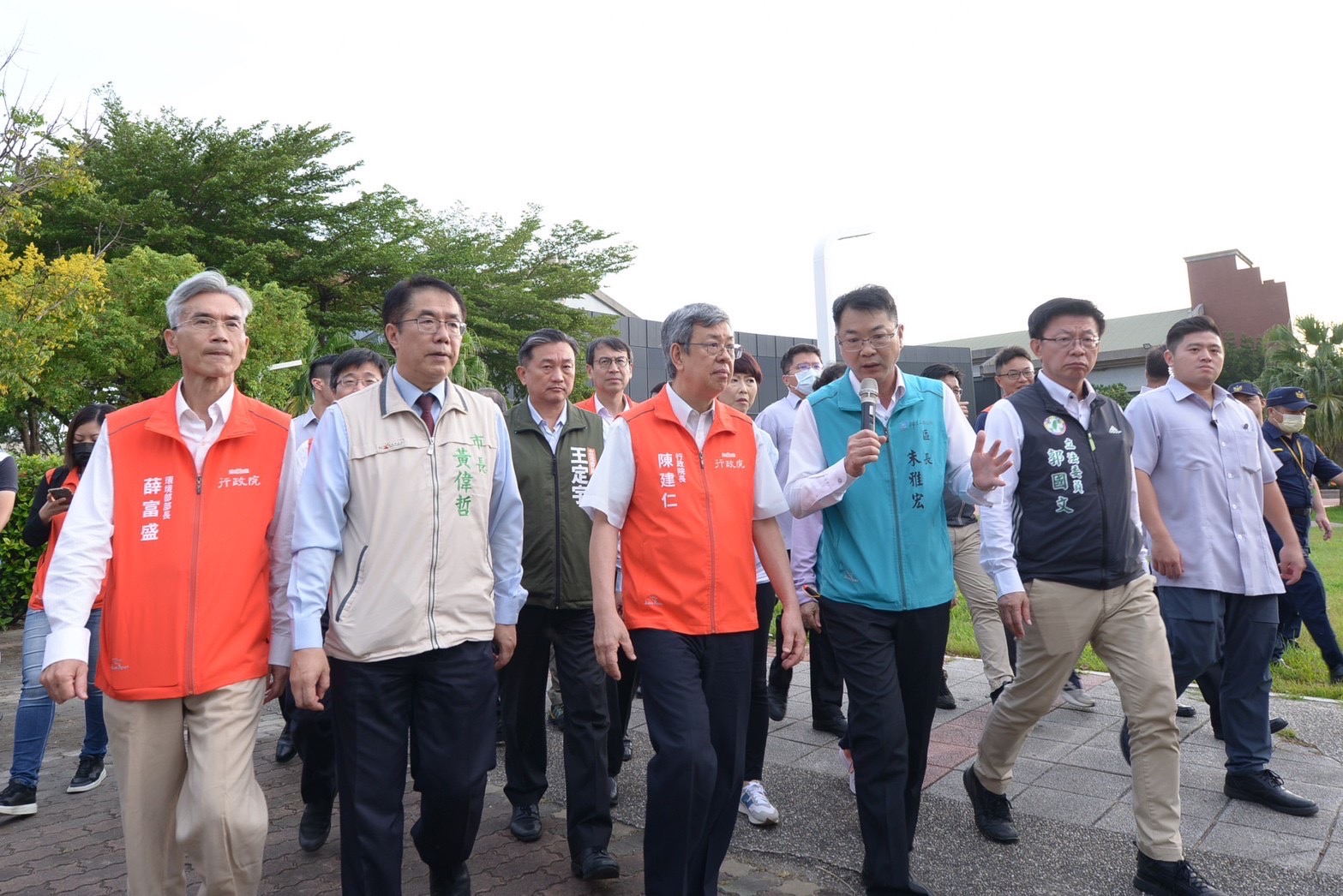 陳院長抵達後,先聽取衛福部疾管署羅一鈞副署長及臺南市趙卿惠副市長分別說明登革熱疫情防治工作簡報;隨後,陳院長與行政院李孟諺秘書長、林子倫發言人、環境部薛富盛部長、環境管理署顏旭明署長、衛福部周志浩次長、疾管署羅一鈞副署長、黃偉哲市長、立法委員王定宇、郭國文、陳亭妃及陳以信等人,在歸仁區朱雅宏區長的引導下至社區視察空地和空屋的登革熱防治工作,防疫人員並示範如何以自製的「天溝棒」巡檢屋頂天溝水槽,巡檢同時可立即投藥,省時又省力。