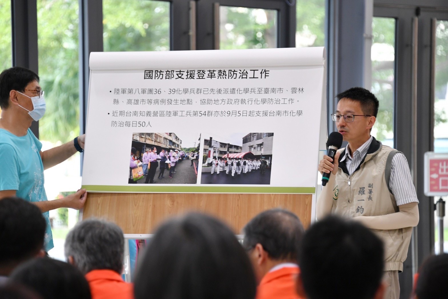 陳院長說,他已請衛福部疾病管制署羅一鈞副署長進駐臺南,盡力提供地方政府必要的行政協助及專業服務,並領導同仁做好登革熱防治工作;另外,他也指示中央部會及轄下機關應以身作則,積極督導所屬同仁,配合臺南市政府防疫措施,將位於臺南市的房舍、空屋、營區做好環境管理及孳生源清除工作。