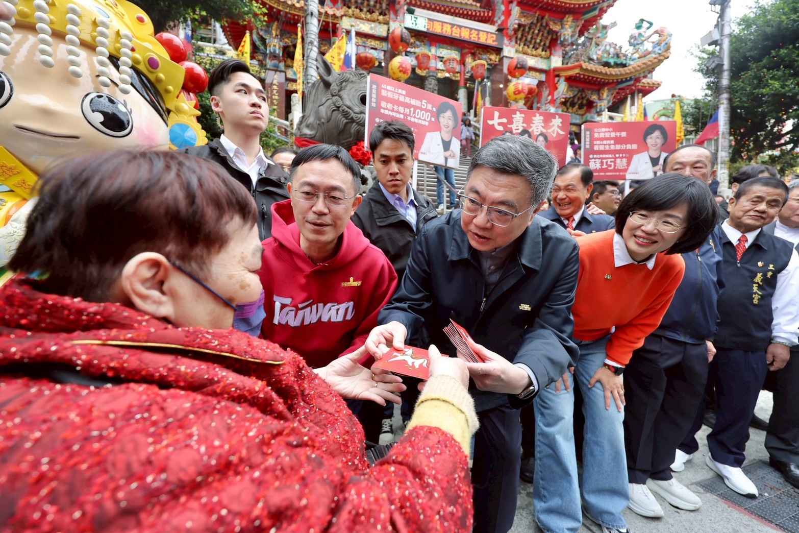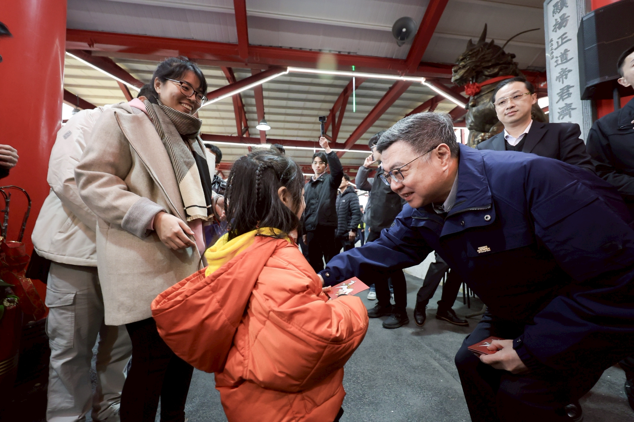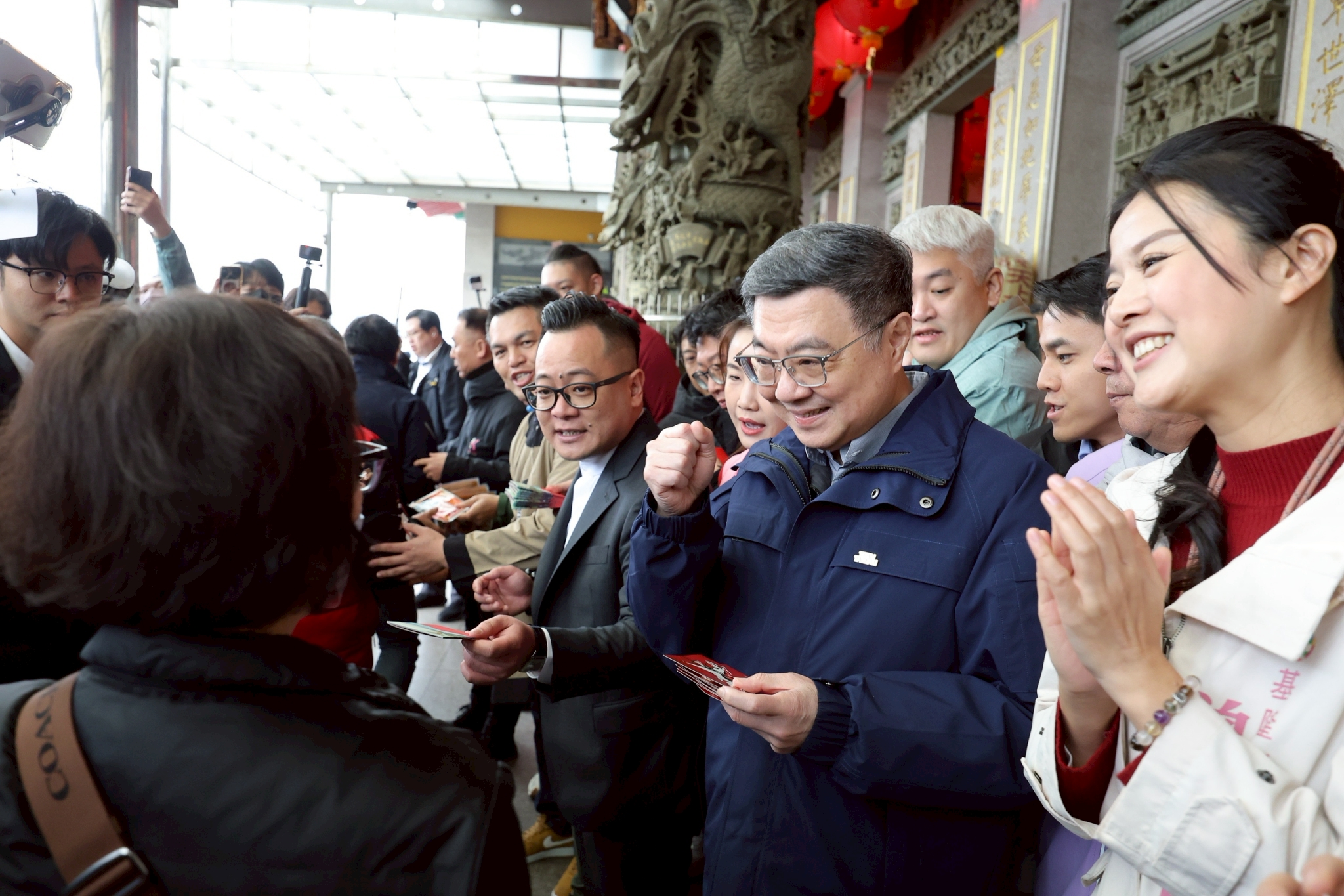 今(18)日為農曆大年初二,行政院長卓榮泰下午偕同李慧芝發言人分別前往新北市汐止濟德宮及三重義天宮參拜祈福,祈求國家風調雨順、國泰民安,並發送總統賀歲福袋向在場鄉親拜年,祝福大家新年快樂,現場湧入許多......【詳全文】