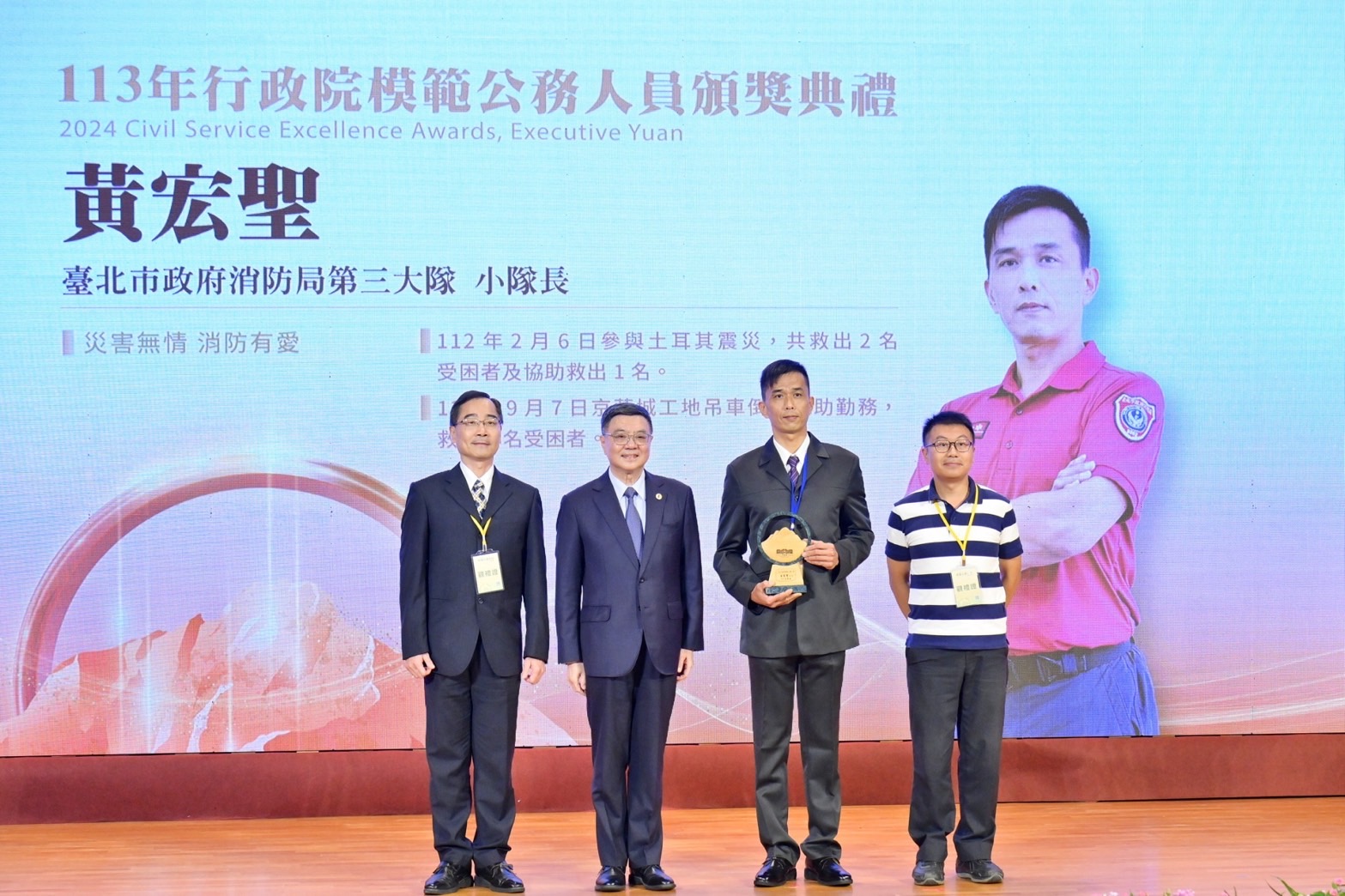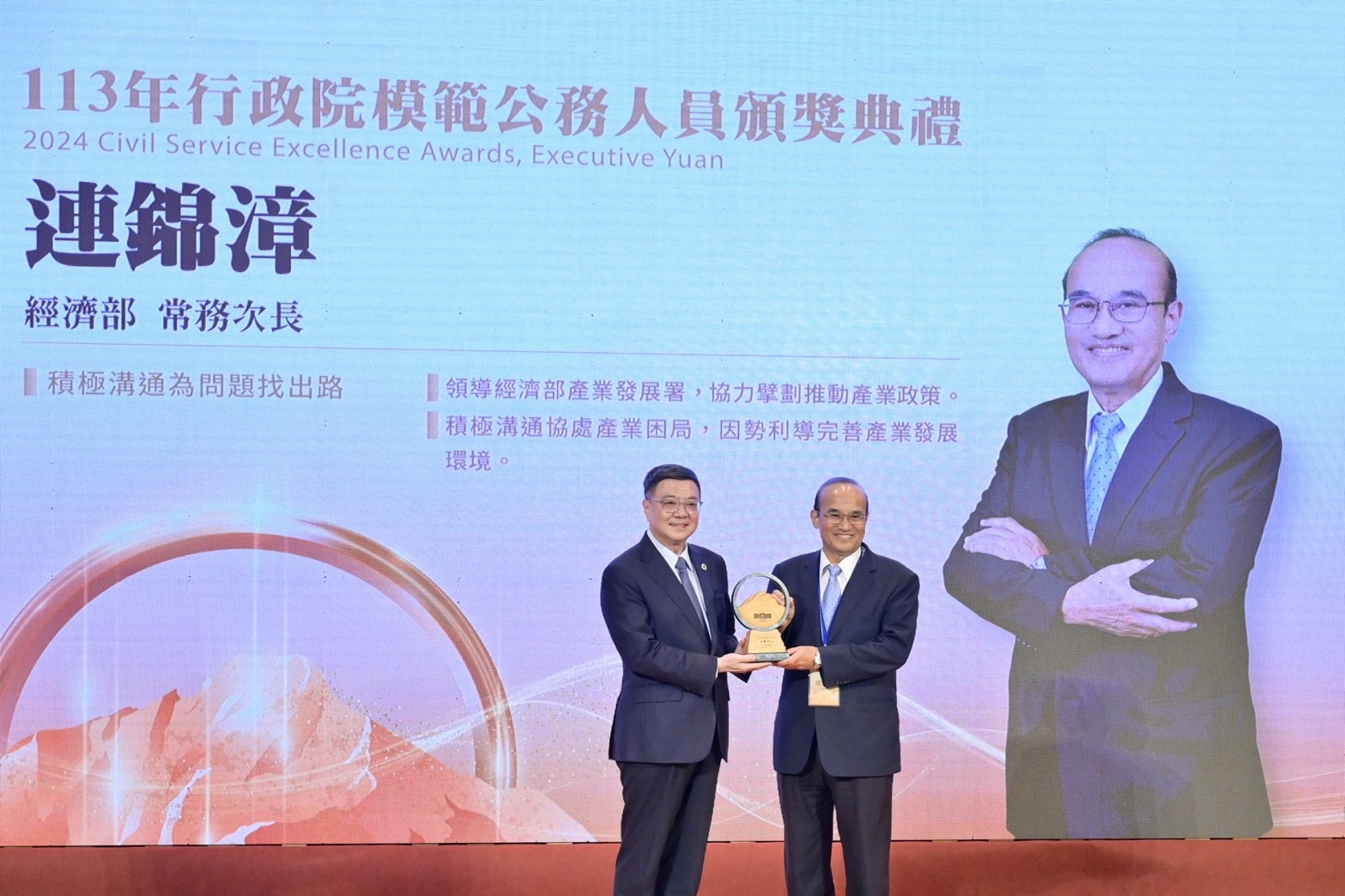 行政院長卓榮泰今(13)日出席「113年行政院模範公務人員頒獎典禮」,頒獎表揚35位獲獎模範公務人員的貢獻,並期許大家保持敏銳,隨時創新進步;秉持「誠意溝通、人民優先」原則,與國會和人民妥適溝通;以及......【詳全文】