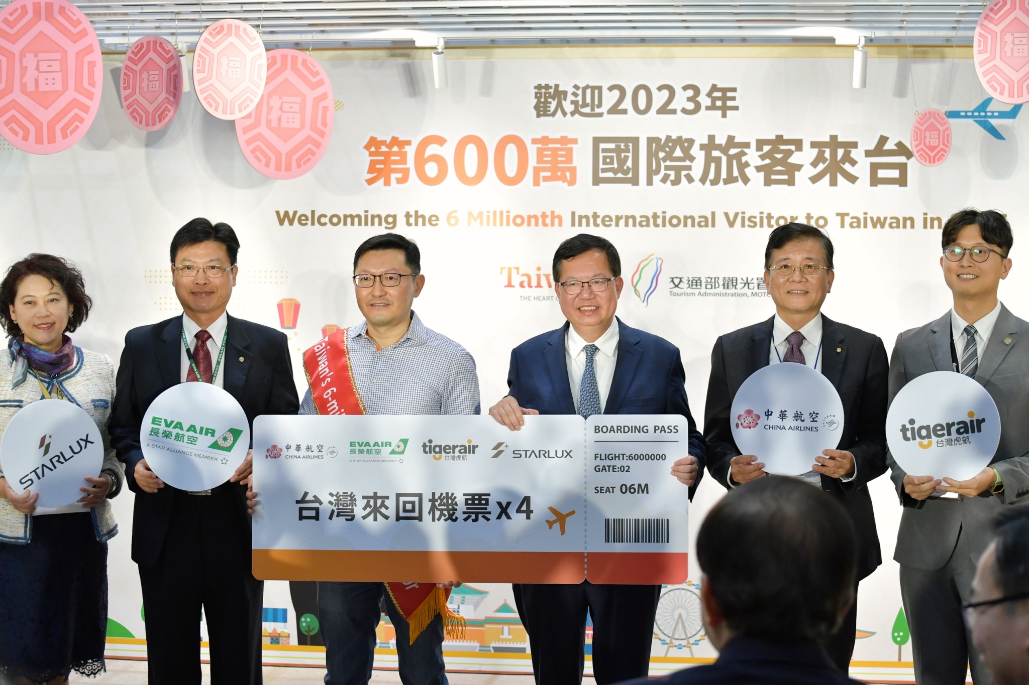 行政院副院長鄭文燦今(15)日赴桃園國際機場出席「2023年第600萬名來臺旅客迎賓活動」,恭喜新加坡國籍陳先生(Tan Chong Lim)成為今(2023)年第600萬名來臺的國際旅客。鄭副院長表......【詳全文】