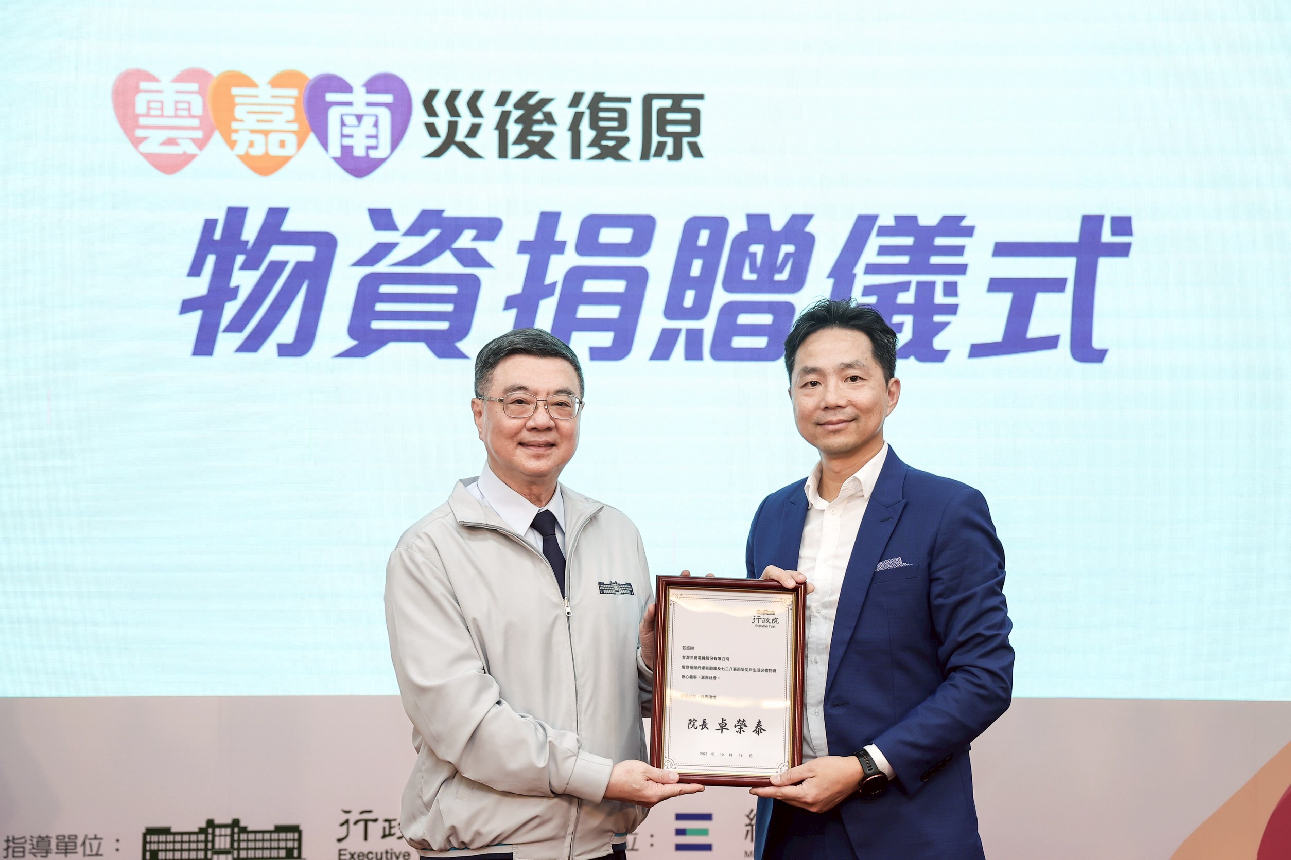 行政院長卓榮泰今(18)日前往臺南市政府民治市政中心出席「雲嘉南災後復原物資捐贈表揚儀式」時表示,近來臺灣面臨許多自然界挑戰,從丹娜絲颱風、七二八豪雨,到花蓮馬太鞍溪堰塞湖及立霧溪堰塞湖,今日上午還發......【詳全文】