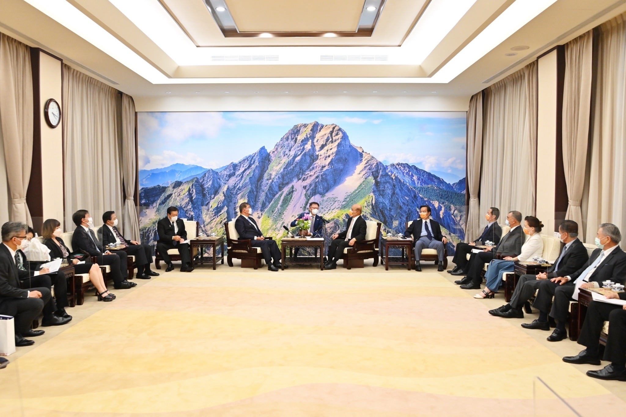 地點:行政院大禮堂1.因防疫考量,各媒體限1名文字記者入場,並由中央社及新傳處提供照片;影像採「共訊」方式辦理,已協調SNG聯誼會共訊。 2.開放媒體至致贈禮品暨合影結束。 3.欲採訪媒體,請於10:15至行政院記者室集合,並請由本院北平東路門口進入院區。 4.配合防疫,媒體朋友請全程佩戴口罩、保持社交距離。