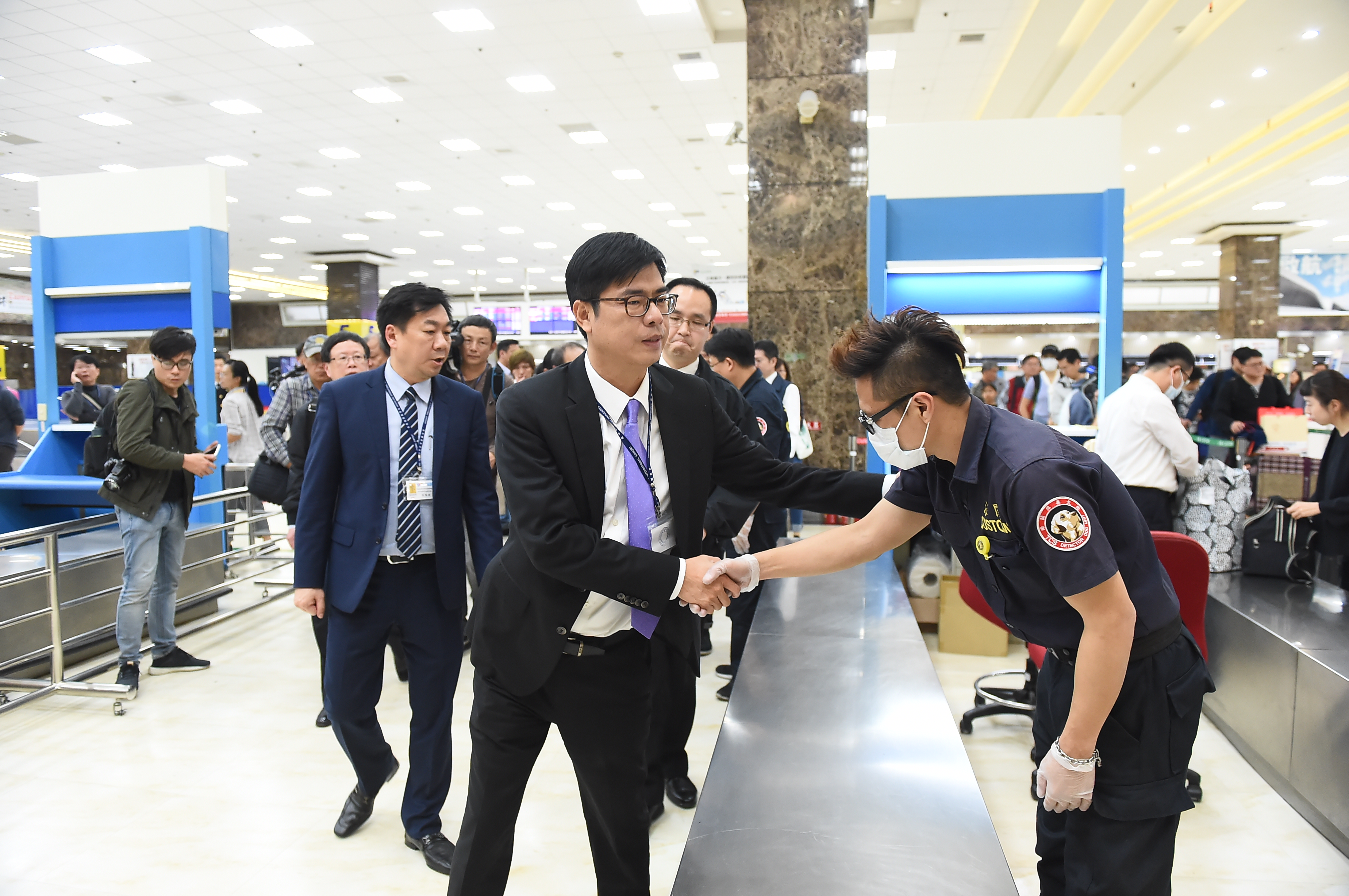 行政院副院長陳其邁今(1)日至高雄國際機場視察入境旅客通關檢查執行作業情形並慰勞第一線同仁。陳副院長表示,高雄國際機場是台灣重要國門之一,春節期間出入境旅客眾多,非洲豬瘟防疫工作更要落實,而蘇貞昌院長......【詳全文】