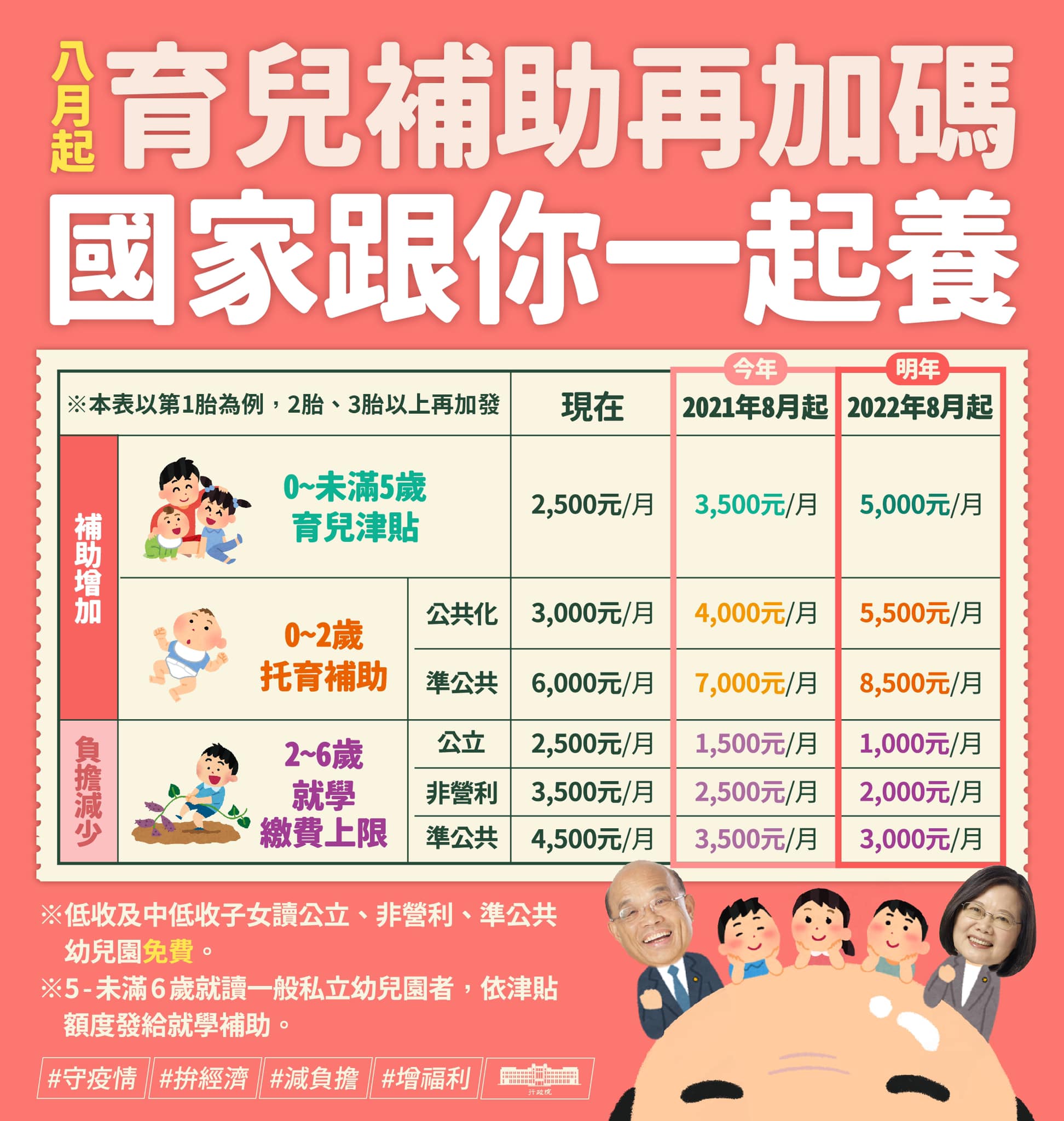 蘇院長今日要向國人同胞報告好消息,目前的育兒津貼是2,500元,今(110)年8月將增加到3,500元,明(111)年8月調高到每月5,000元。除了加津貼,還有增名額、減負擔等種種的利多。幼兒園就學費用,自今年8月起,每月少繳1,000元;明年8月,每月再少繳500元,每月最高繳費不超過3,000元,第2、3胎還再分別減收1,000及2,000元。四年內政府也將持續擴增公共化托育與公共化幼兒園,合計再增加6.4萬個名額,讓孩子可以享受到評價幼托服務。