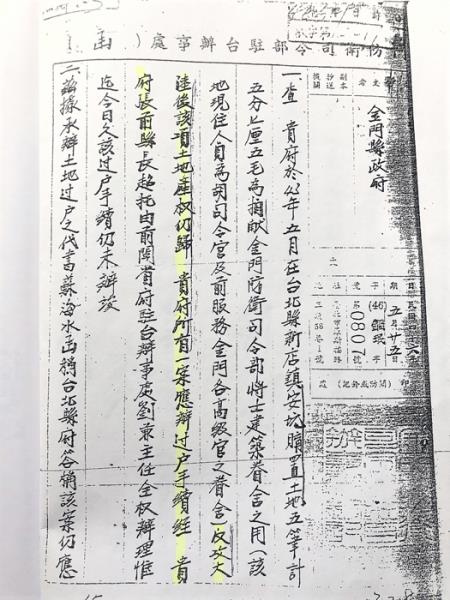 另有一紙當年6月金門縣政府函復金門防衛司令部駐台辦事處,同意委由福建省政府駐台辦事處全權辦理土地過戶手續委託書,亦有「本府前在台北縣新店鎮安坑購置土地5筆,計5分7厘5毛,為捐獻金門防衛司令部將士建築眷舍之用,反攻大陸後上項土地產權仍為本府所有……。」兩紙公文內容陳述相同,因此足堪認定為土地乃金門縣政府於43年5月購買之證據。