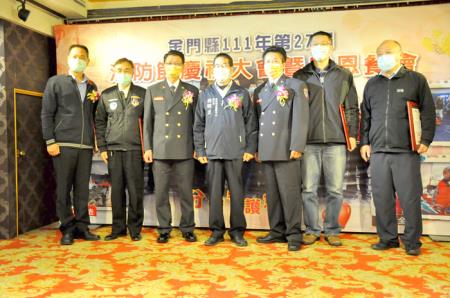 金門縣一一一年第二十七屆消防節慶祝表揚大會活動昨天舉行,縣長楊鎮浯頒獎表揚二十位績優消防、義消、志工人員,感謝消防團隊的辛勞與奉獻;另與會貴賓金馬聯合服務中心執行長翁明志、議員李養生、王碧珍分別應邀頒發感謝狀、退休紀念禮品和志願服務獎章證書,與祝賀消防節快樂。同時,縣長楊鎮浯期勉消防弟兄培養新常態的能力、面對一切挑戰,共同努力與打拚,以良好工作態度與具體方法,爭取民眾的信賴與支持,建立一個以民為本的專業消防團隊,以保障民眾生命財產安全。