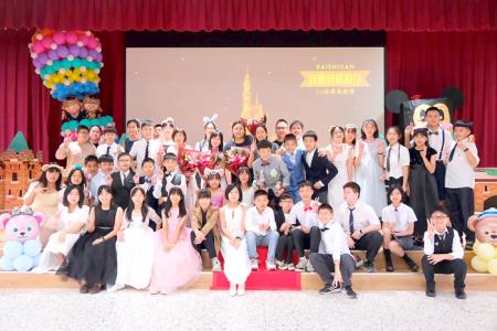 開瑄國小於昨(17)日舉行第114級畢業典禮,主題為「夢‧響起的那天」,巧妙結合今年畢業旅行前往香港迪士尼的經驗,典禮以充滿夢想與魔法的迪士尼風格佈置呈現,整場活動融合戲劇、音樂、藝術與AI科技,為42位畢業生打造一場難忘的童話畢業盛典。