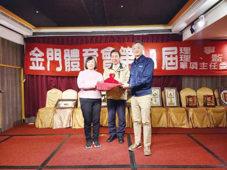 金門縣體育會第十三屆理事長交接典禮在昨日晚間六時在葡京餐廳舉行,縣長陳福海、行政院金馬聯合服務中心執行長吳增允、議員洪成發、蔡其雍、陳錦偉、董森堡、蔡水游、縣府教育處副處長洪蘋萱、議會秘書長王垣坤、國民黨金門黨部前主委林芳旋、中華民國體育總會總會長鄭錦洲、中華民國體育總會暨中華民國田徑協會秘書長王景成、台灣體育總會理事長汪輝等人,以及體育會各單項運動委員會、體育界人士等到場觀禮、祝賀。