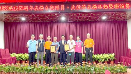 縣長陳福海偕與會貴賓頒獎表揚20位績優自衛隊員、5位模範徵屬、10位績優幹部、以及團體獎-金沙鎮公所。823戰役戰友協會也在縣長陳福海監交下,完成印信交接與授旗儀式,由原任理事長鄭慶利交棒予新任理事長黃文遠,並由縣長陳福海等頒獎表揚5位戰友楷模。