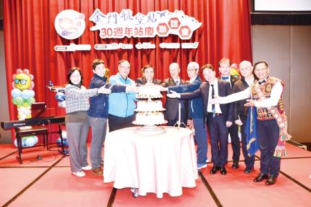 飛躍30‧浯慰人心、幸福金站!金門航空站三十週年站慶聯誼活動於昨(一)日晚假昇恆昌金湖飯店舉辦,在迎賓音樂揭開序幕後,金門縣副縣長李文良、行政院金馬聯合服務中心執行長楊上德、航站主任洪念慈和貴賓一同切站慶蛋糕,分享航站三十歲生日的喜氣。同時,洪念慈致詞講述金門航空站發展週程和成果,未來將在既有基礎上,秉持著繼往開來精神,再創金門航站另一個三十年的願景。