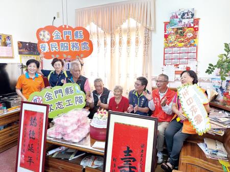金門縣榮民服務處長劉信義偕同服務團隊及榮欣志工一行,於日前至金沙鎮山西梁淑貞阿嬤家中慶祝百歲壽誕,並邀請地方仕紳一同參與,並代表輔導會主任委員嚴德發致送金壽桃一座,祝賀梁阿嬤福如東海、壽比南山,現場洋溢著熱鬧又溫馨的祝福。