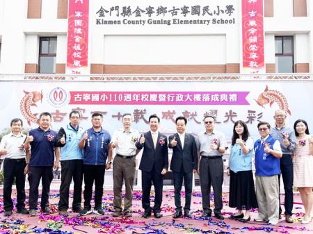 古寧國小為迎接建校110週年,特結合新校舍落成舉辦「古寧國小110週年校慶暨行政大樓(活動中心)落成典禮」,新穎壯觀的校舍和綠草如茵的運動草坪,讓人眼睛為之一亮。縣長陳福海、議長洪允典親自到場祝賀古寧國小110歲生日快樂,陳縣長並強調縣府未來會繼續用心扎根孩子的教育,洪議長也表示,議會對於教育預算會全力支持。