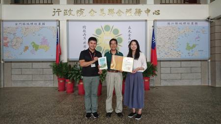 本中心協助中央研究院執行「台灣人體生物資料庫研究計劃」相關宣導招募活動之推廣 推廣組組長劉怡君博士致贈感謝狀 由翁明志執行長代表本中心接受