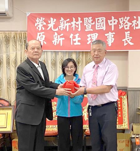榮光新村暨國中路社區發展協會,日前辦理原、新任理事長交接典禮,在社會處副處長王茲繐監交下,由原任理事長張光海交接印信予第六屆理事長王添泉。