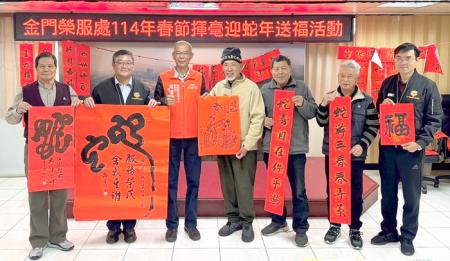 為配合國人年節貼春聯習俗,金門榮服處與行政院金馬聯合服務中心、財團法人榮民榮眷基金會,於8日在金門榮服處五樓會議室共同辦理寫春聯書法活動,邀請將軍書法家鄭有諒、金門書法學會理事長徐心富、該會陳應德老師及前處長呂媽定,齊聚一堂揮毫寫春聯送給地區榮民眷,讓大家一同感受過年氣氛。
