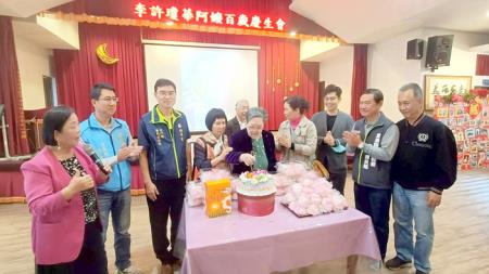 金門縣榮民服務處日前上午至金門縣大同之家,為百歲榮民李許瓊華阿嬤慶生。這次慶生活動格外隆重,除了金門榮民服務處的代表外,還有多位政府官員和地區代表出席。