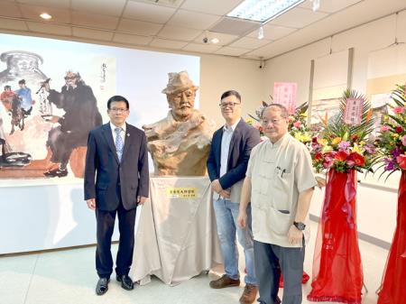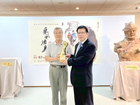為紀念李奇茂致力推廣藝術教育之功,開幕活動中,由著名藝術家田文筆及唐健風理事長代表捐贈其在全國巡迴展「向當代百大藝術家致敬」之首的李奇茂大師塑像,由金大校長陳建民代表受贈,並回贈感謝狀。畢業於國立台灣藝術大學版畫藝術研究所的田文筆,現任畫東畫西畫會會長,其雕塑的不只是藝術家精神永存的身影,更是期待金大師生效法李教授為藝術無私奉獻的精神,為金大邁向未來文化推廣的基石。