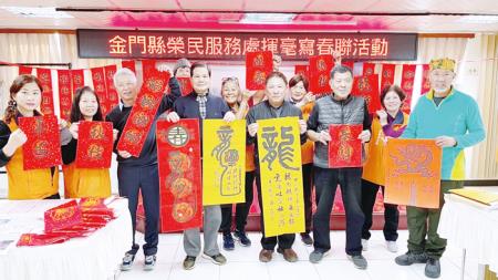 金門縣榮民服務處辦理揮毫寫春聯活動。該活動係與行政院金馬聯合服務中心共同舉辦。於1月18日上午假榮服處五樓會議室辦理。活動邀請有將軍書法家鄭有諒和呂媽定兩位前處長,以及金門書法學會理事長徐心富,該會成員陳應德老師等,齊聚一堂揮毫寫春聯,準備將贈送給地區榮民眷,傳遞佳節祝福,也讓大家新年除舊佈新,一同感受過年的氣氛。